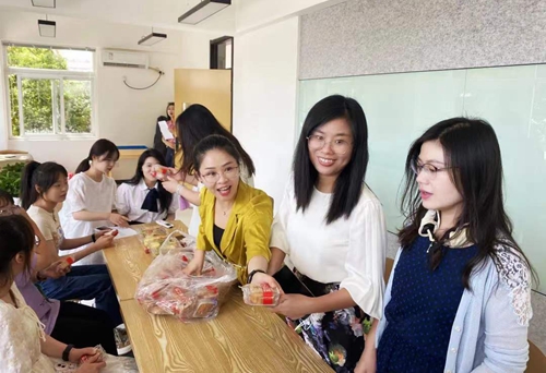 老师们为同学们准备了月饼和水果,学生们为老师献上了鲜花。师生们一起座谈,一起聊中秋节的由来,聊中国的优秀传统文化。
