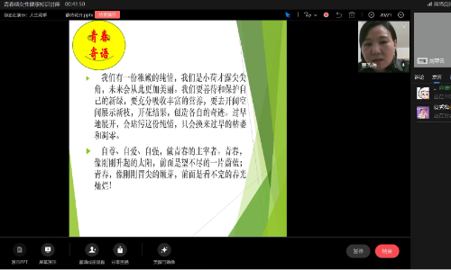 讲座最后党支部书记杨春娟对今天的讲座进行了总结,她希望同学们要树立”自尊、自爱、自信、自强“的积极健康形象,在最美的年纪绽放最美的自己,不负青春,奋力前行,树立正确的人生观。