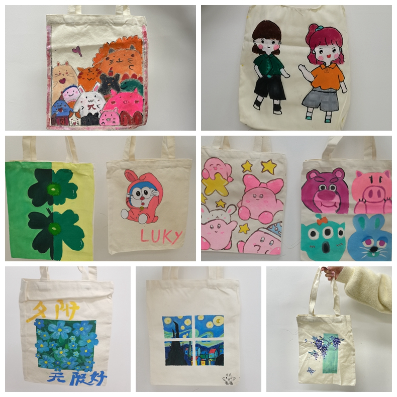 其他同学们分别在教室、宿舍里也开始制作,活动中,同学们发挥着自己的奇思妙想和艺术灵感,每一笔线条、每一抹色彩都是对美好生活最生动的诠释,满满手作温情,增添了斑斓的色彩,每个人都有艺术的潜能。经过几小时的涂色,大家都完成了独属于自己的创意作品,字母或者文字图案的帆布包,简约大方,张扬个性;风景或者人像图案的帆布包,简约中透着特别,诠释不一样的自己;动物简笔画图案帆布包,清新呆萌,自带可爱气质,每一份手绘,都有其独特的意义。一个小小的帆布包,不只是简单的装载物品,还是自己创意的体现。