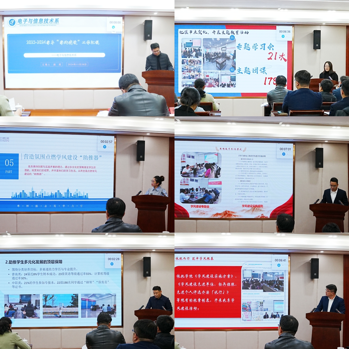 各系分管学生工作的负责人围绕学风建设的思路、举措和成效总结了2023-2024学年以来的重点、亮点及特色工作,同时以详实的数据、丰富的图片和典型的工作实例对学风工作成效进行展示,赢得了现场观众和评委老师的阵阵掌声。由人事处、党群工作部、教务处、学生处等部门主要负责同志共计7人组成的评委组,根据评选工作要求,本着公平、公开、公正原则,针对各参评系部的成果汇报进行评分。