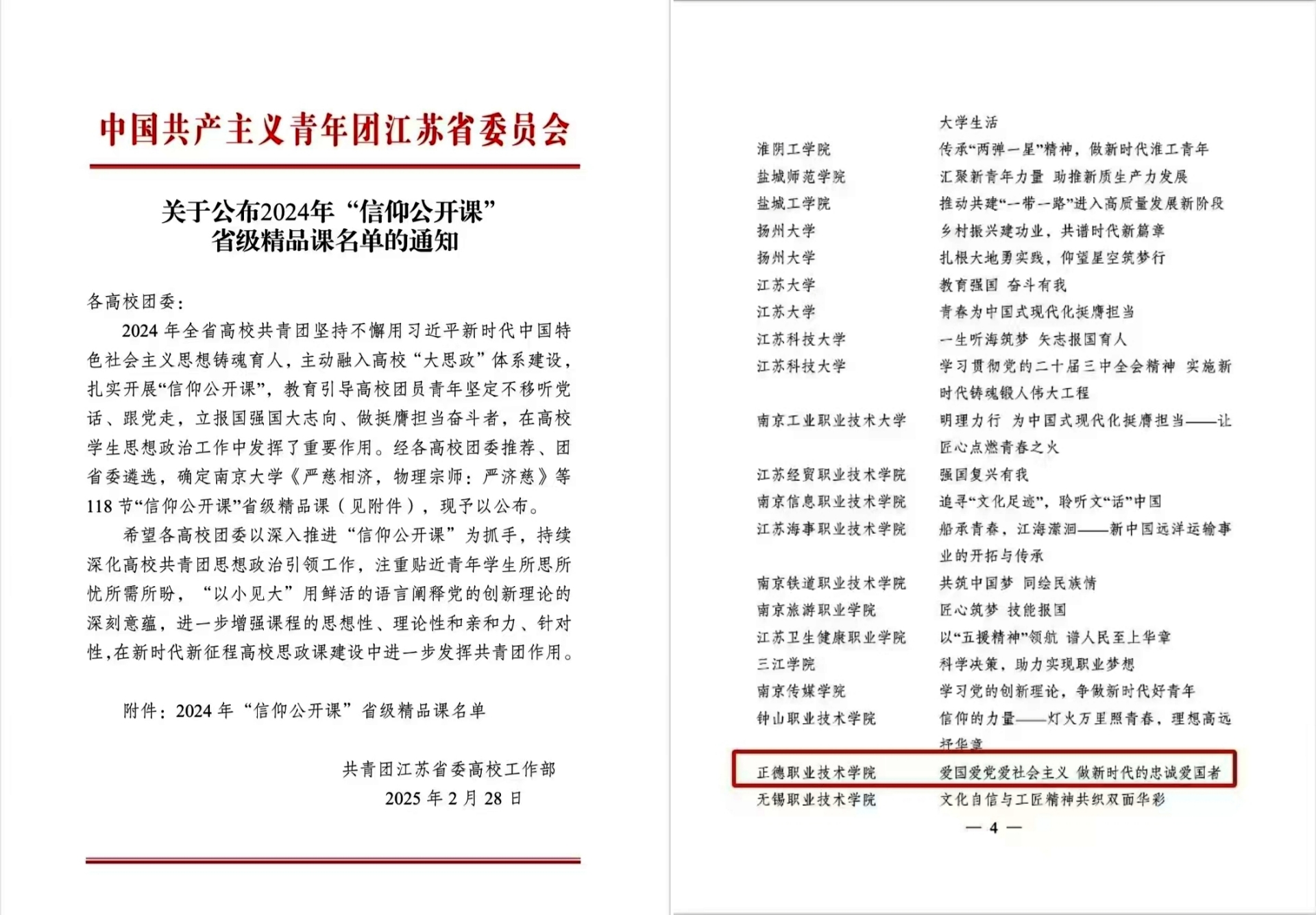 近日,共青团江苏省委正式发布了《关于公布2024年“信仰公开课”省级精品课名单的通知》。经过各高校团委的精心推荐和团省委的严格遴选,全省范围内共评选出118节 “信仰公开课”入选“省级精品课”,澳门六合彩论坛 提交的作品《爱国爱党爱社会主义 做新时代的忠诚爱国者》成功入选。