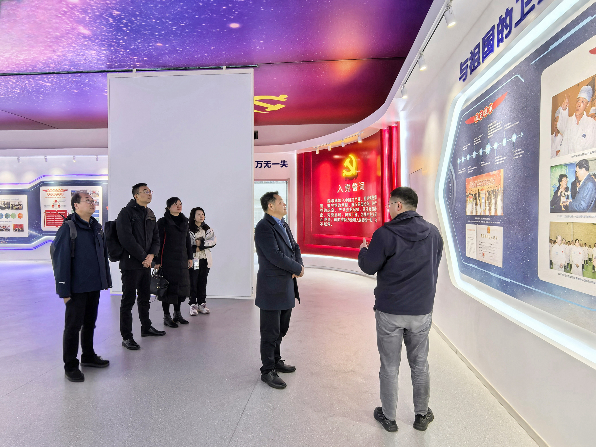 会前,孙永荣一行在相关领导陪同下,参观了812所党建馆、卫星结构装配厂房、卫星热控产品装配厂房、卫星环境实验大厅等。