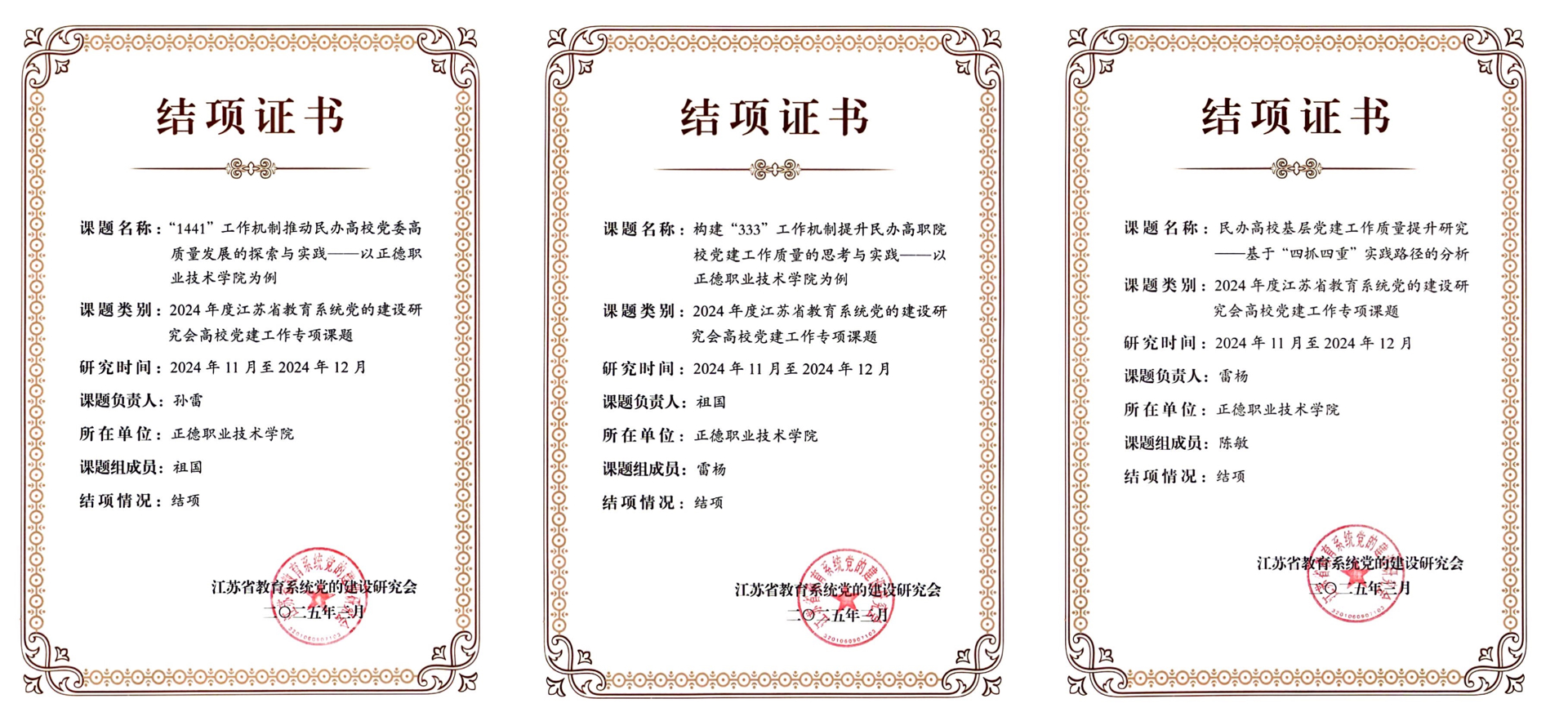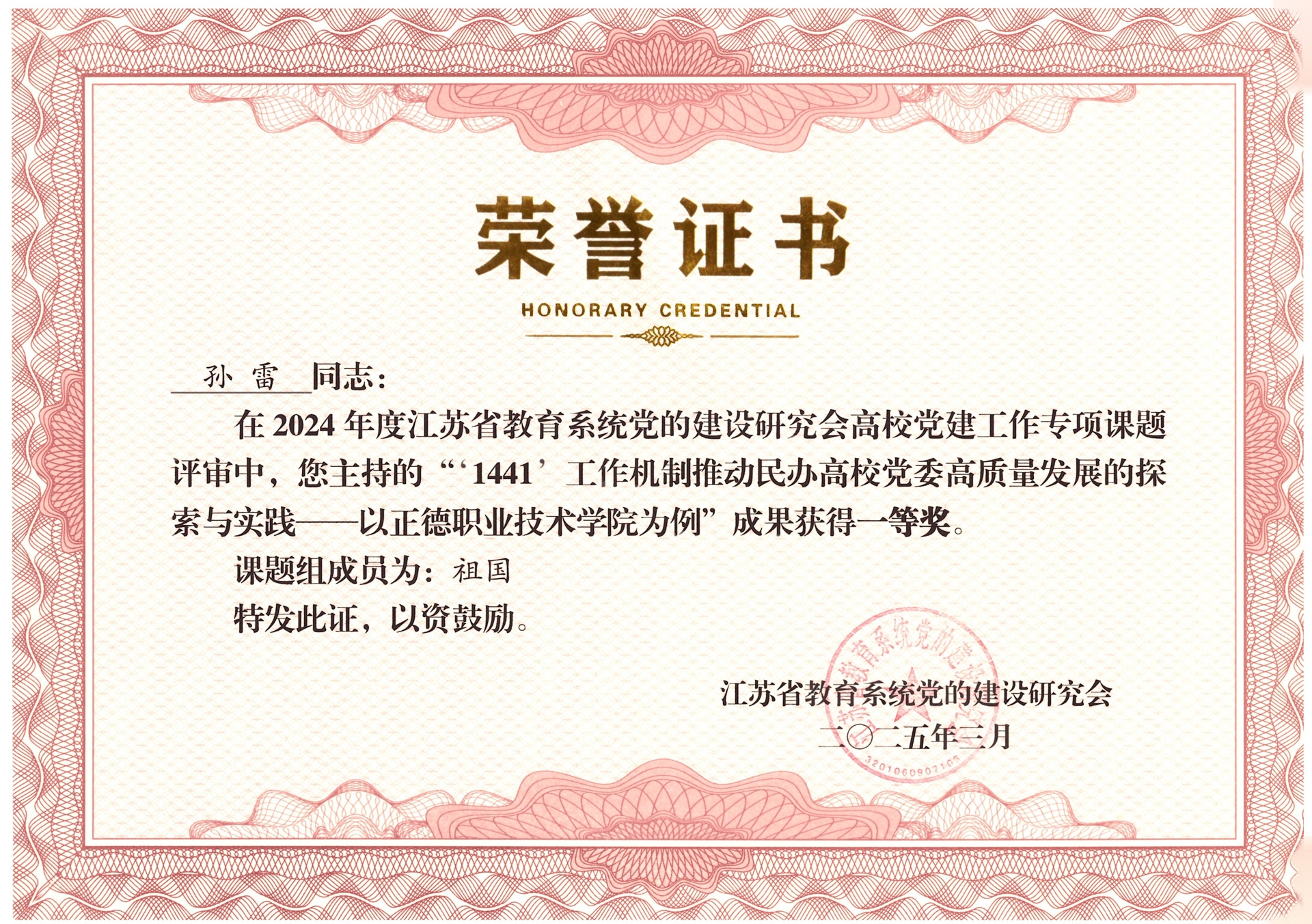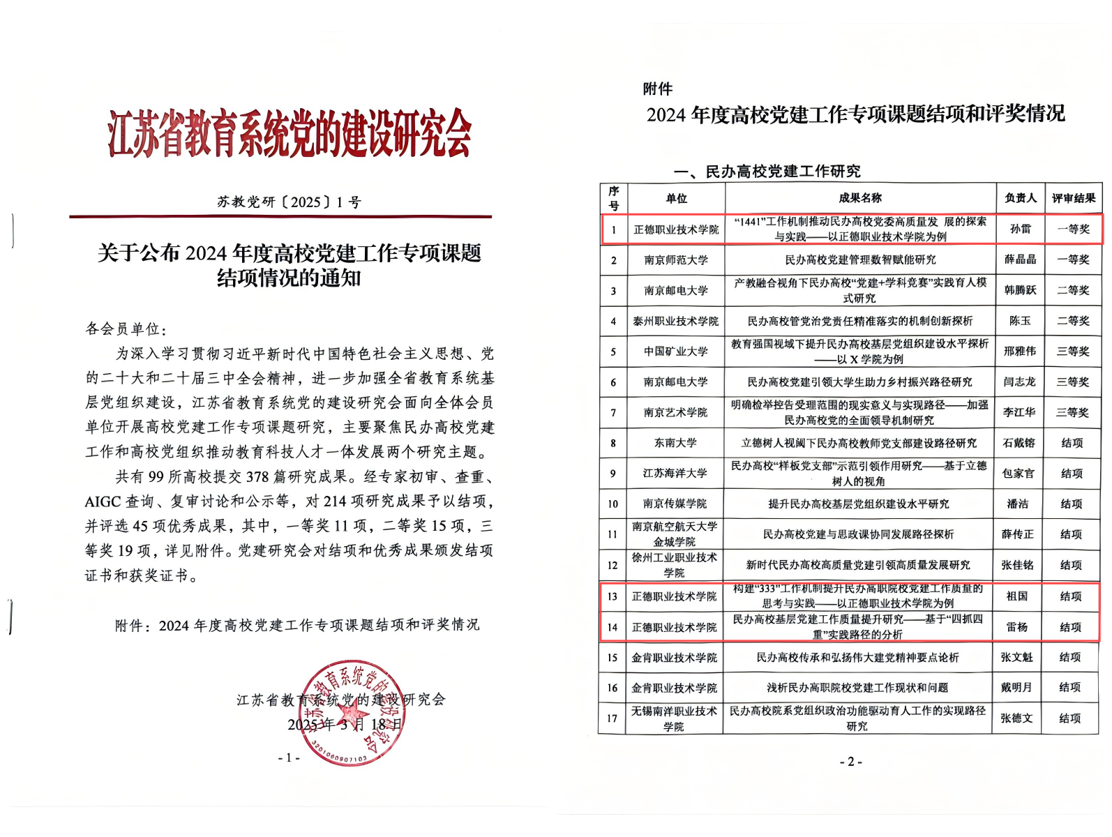 江苏省教育系统党的建设研究会组织开展的2024年度高校党建工作课题评审结果近日公布,经申报、评审、公示后,澳门六合彩论坛 有三项课题顺利结项,其中,由澳门六合彩论坛 党委书记、政府督导专员孙雷主持的《“1441”工作机制推动民办高校党委高质量发展的探索与实践》课题研究成果喜获一等奖,获奖及结项情况位居全省民办高校第一。