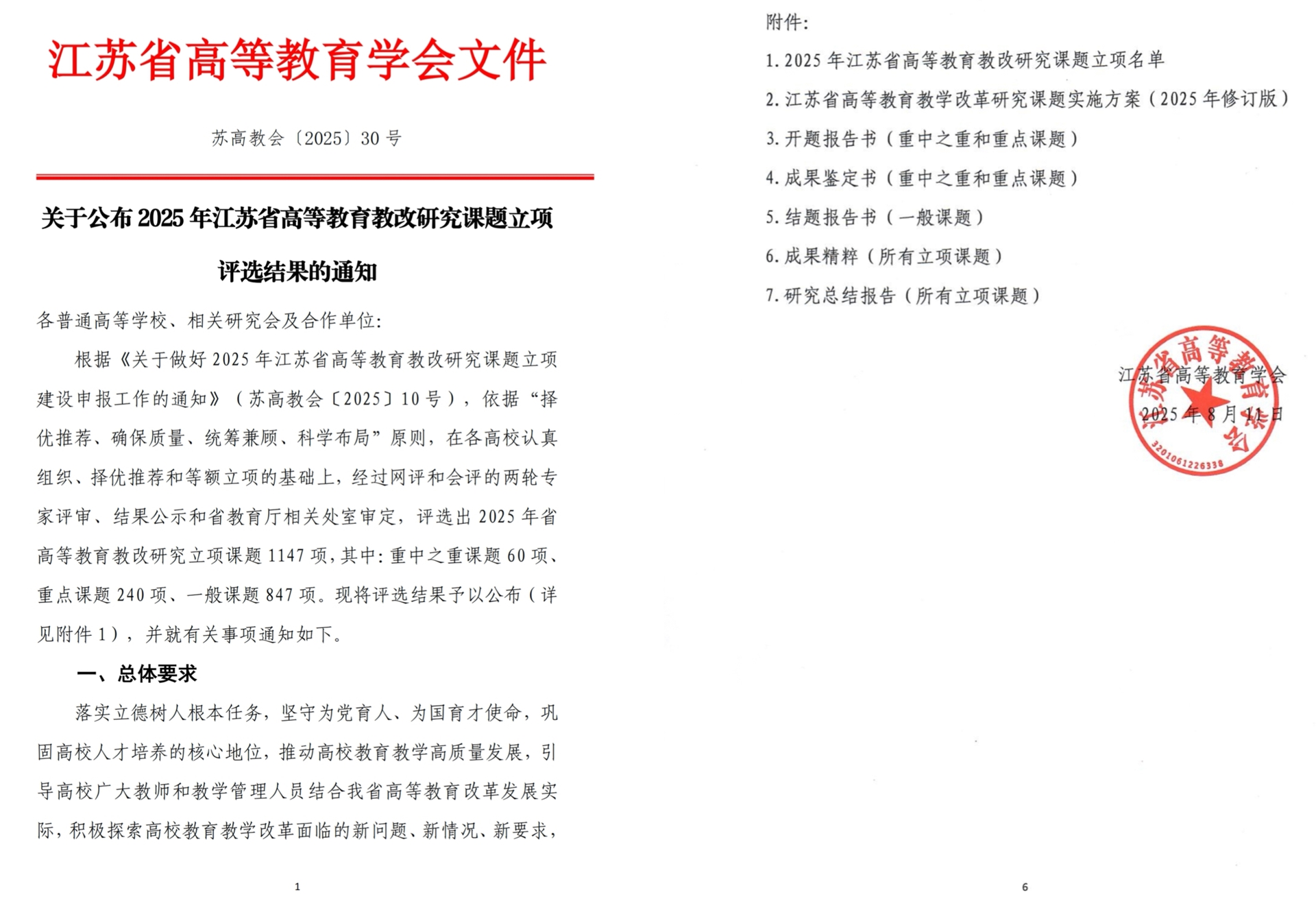 近日,从江苏省高等教育学会传来喜讯,澳门六合彩论坛 在2025年江苏省高等教育教改研究课题申报中表现出色,推荐的4项课题成功获批立项。这一成绩的取得,彰显了学院在教育教学改革方面的积极探索与显著成效,也为学院进一步提升人才培养质量注入了新的动力。