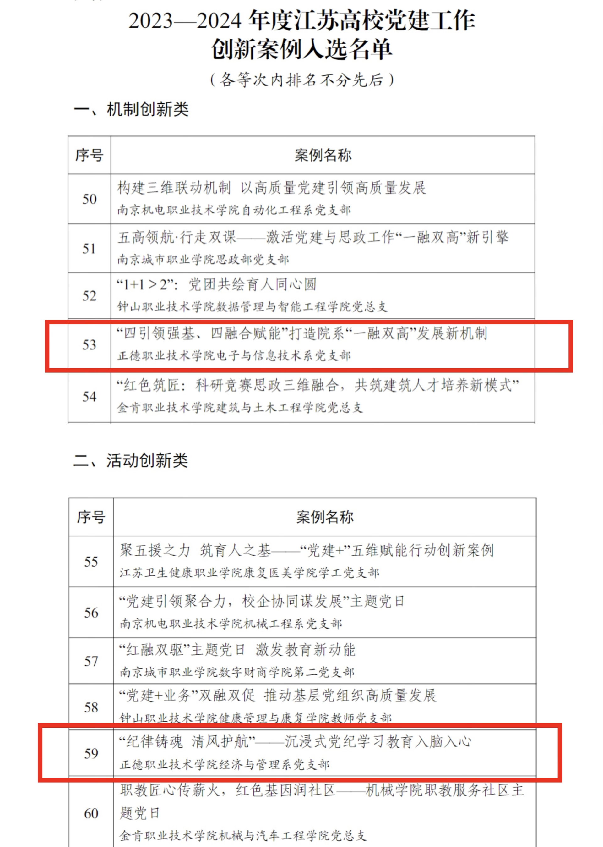 近日,江苏省委教育工委公布2023-2024年度江苏高校党建工作创新案例评选结果。澳门六合彩论坛 推荐报送的2项案例全部入选,电子与信息技术系党支部“‘四引领强基、四融合赋能’打造院系‘一融双高’发展新机制”案例荣获机制创新类三等次,经济与管理系党支部“‘纪律铸魂 清风护航’—— 沉浸式党纪学习教育入脑入心”案例荣获活动创新类三等次。