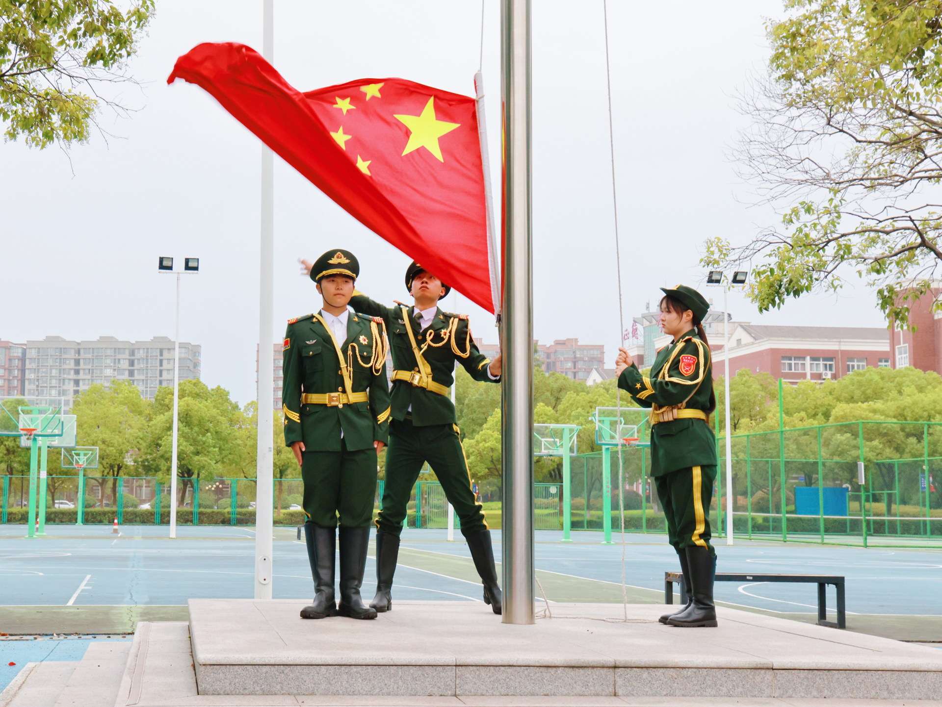 清晨时分,田径场上师生肃立,伴随着雄壮的国歌,五星红旗冉冉升起,师生庄严地行注目礼。