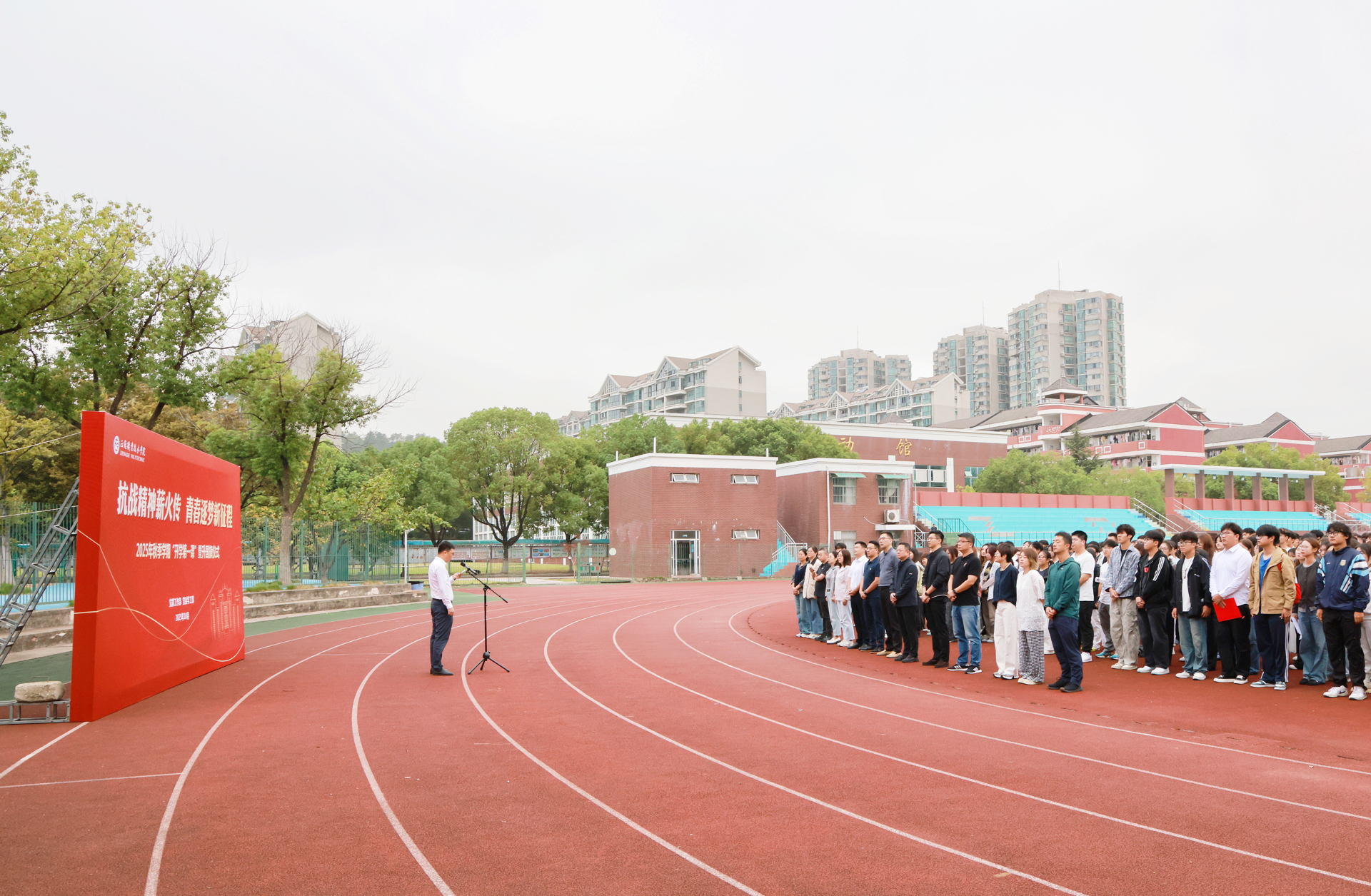 10月13日,由院党群工作部、党委学生工作部主办的2025年秋季学期“开学第一课”暨升国旗仪式在田径场举行。院党委书记、政府督导专员孙雷在国旗下为师生讲授了新学期的第一堂思政课。相关职能部门负责人、各系党支部书记、辅导员代表及电子与信息技术系700余名大一新生到场聆听。活动由党委学生工作部部长、学生处处长祝佳俊主持。