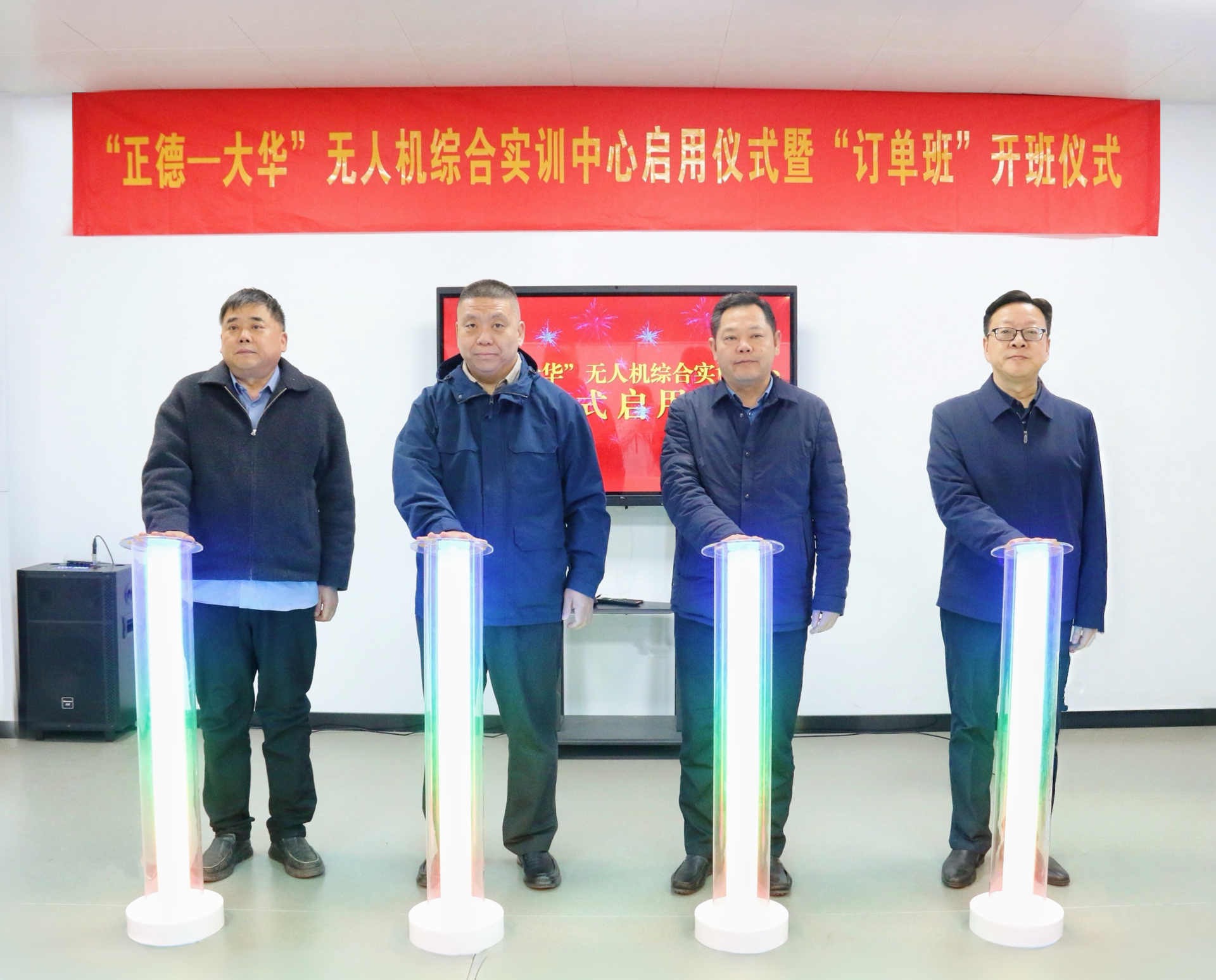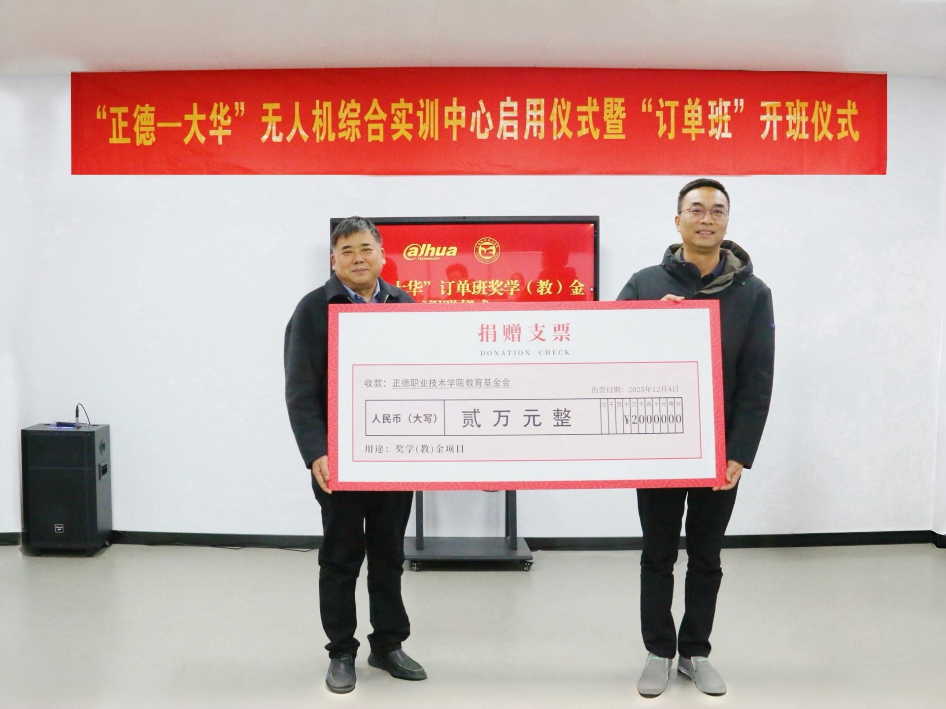 在全场嘉宾与师生的共同见证下,孙永荣、刘晓勇、赵凯雷、官建军共同点亮灯柱,为“澳门六合彩论坛 -大华”无人机综合实训中心按下启用键。随后,方鸣子与刘佳共同为“澳门六合彩论坛 —大华”订单班揭牌;官建军代表企业向学院捐赠奖学(教)金,为师生成长与教学发展提供坚实保障。订单班班主任及学生代表分别发言,表达了对校企共建平台的感谢之情,承诺将珍惜学习机会,刻苦钻研专业知识、锤炼过硬职业技能,不负校企期望,努力成长为符合产业需求的优质技术技能人才。
