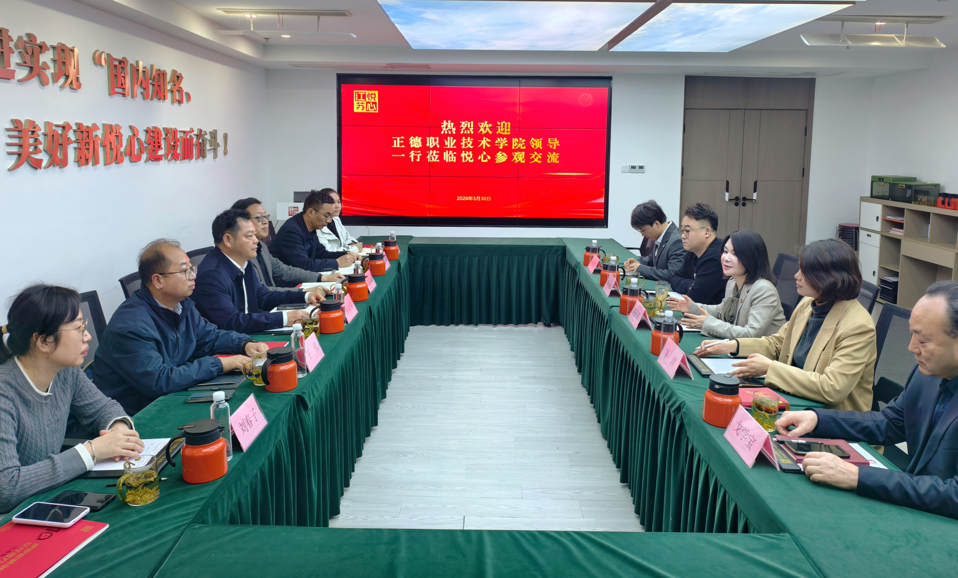 赵凯雷围绕学院基本概况、产教融合、人才培养等方面作了全面介绍。李少帅结合企业项目运营实际需求,系统阐述了岗位用人标准与人才需求规格;茅洋介绍了江苏悦心教育板块国际人才培养等重点项目情况。双方聚焦协同育人、学历提升、社会服务等合作领域,就具体合作事宜进行深入磋商交流,达成多项合作共识。