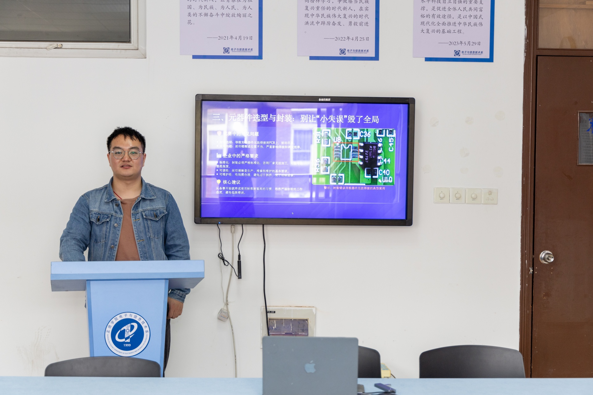 实验指导环节,戴立志针对同学们提交的备赛作品展开精准点评,立足行业规范与企业生产视角,逐一指出设计优化方向,帮助同学们建立“设计服务于量产”的工程思维。