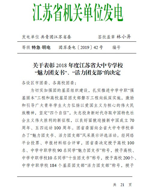 近日,共青团江苏省委下发《关于表彰2018年度江苏省大中专学校“魅力团支书”、“活力团支部”的决定》(团苏委电〔2019〕42号),澳门六合彩论坛 1名同学获评“魅力团支书”,1个团支部获评“活力团支部”。