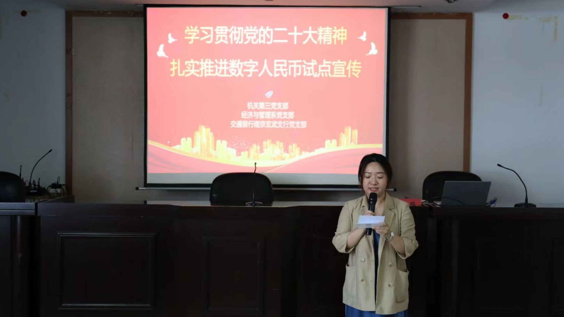 为进一步深入学习贯彻党的二十大精神,对照党的二十大提出的新思路、新要求、新举措,发挥基层党组织党建引领作用,进一步提升专业教师的综合素养,丰富教师的知识体系,推动专业建设新发展,6月8日,机关第三党支部、经济与管理系党支部联合交通银行南京玄武支行党支部在学院7508会议室开展联建联学,共同学习贯彻党的二十大精神,扎实推进数字人民币试点工作。机关第三党支部、经济与管理系党支部全体党员和学生入党积极分子以及交通银行南京玄武支行党支部党员代表等参加本次活动。活动由经济与管理系党支部书记雷杨主持。