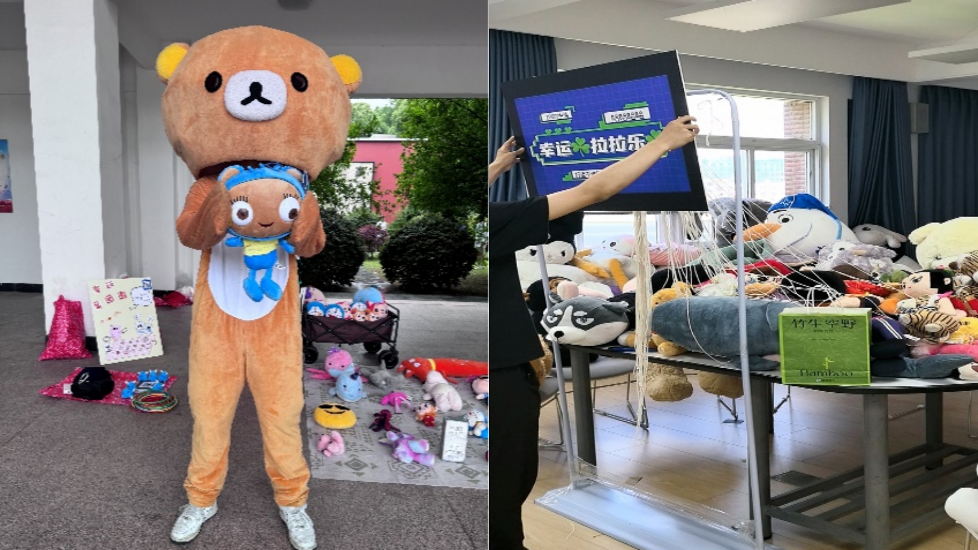 活动现场主要由4大模块构成,分别为打卡拍照、玩偶套圈游戏活动,电商直播实训室的拉拉乐活动,以及电商直播实训室直播及大卖场活动。