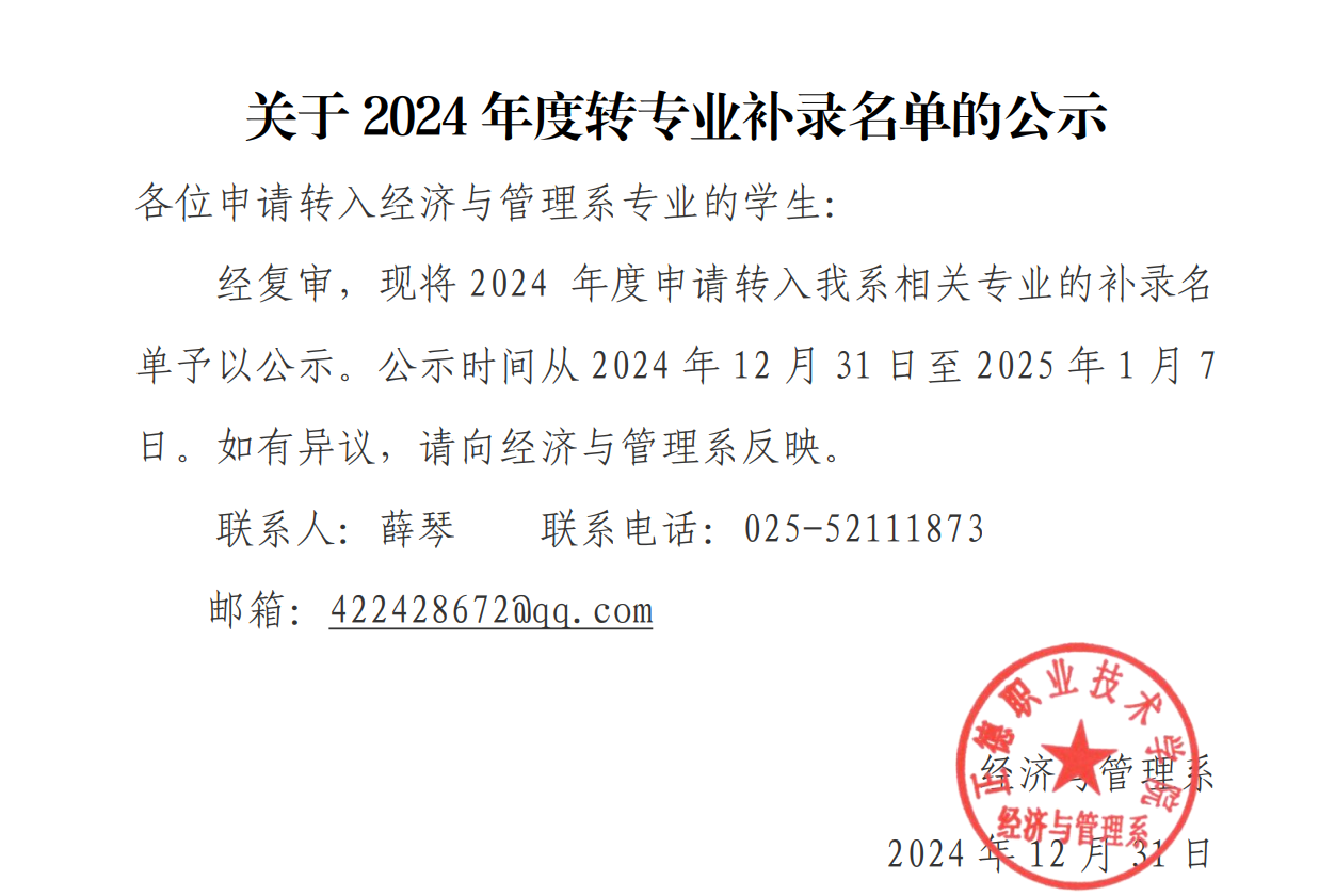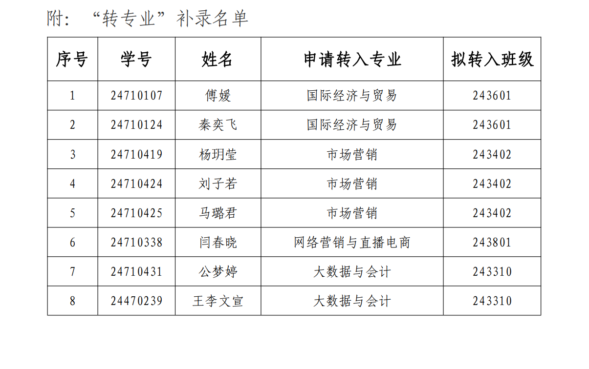 关于2024年度转专业补录名单的公示