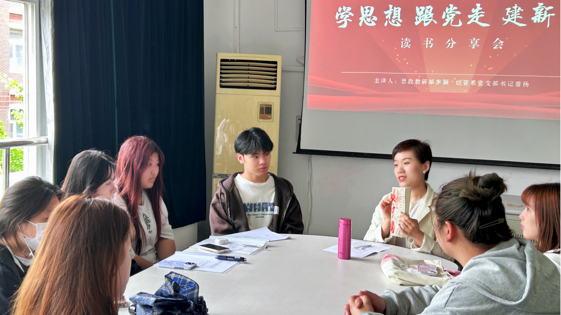 为贯彻落实党的二十大关于深化全民阅读活动的重要部署,在本系内加强阅读引领、涵育阅读风尚,教育引导青年团员坚定理想信念、厚植家国情怀,5月26日,经济与管理系开展了“学思想、跟党走、建新功”主题团日活动。本次活动由思政教研部李颖、系党支部书记雷杨主讲,全体大一团员、入党积极分子到场参加,系团总支书记倪冰慧主持。
