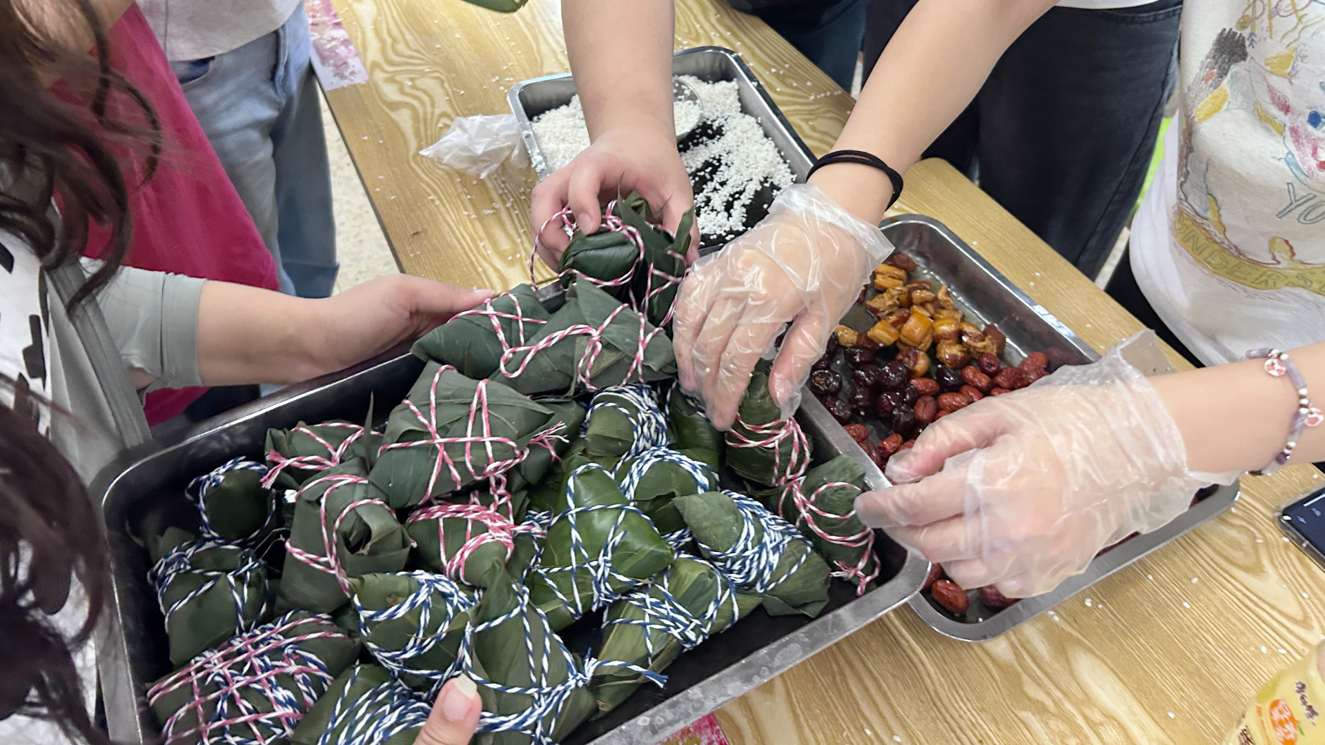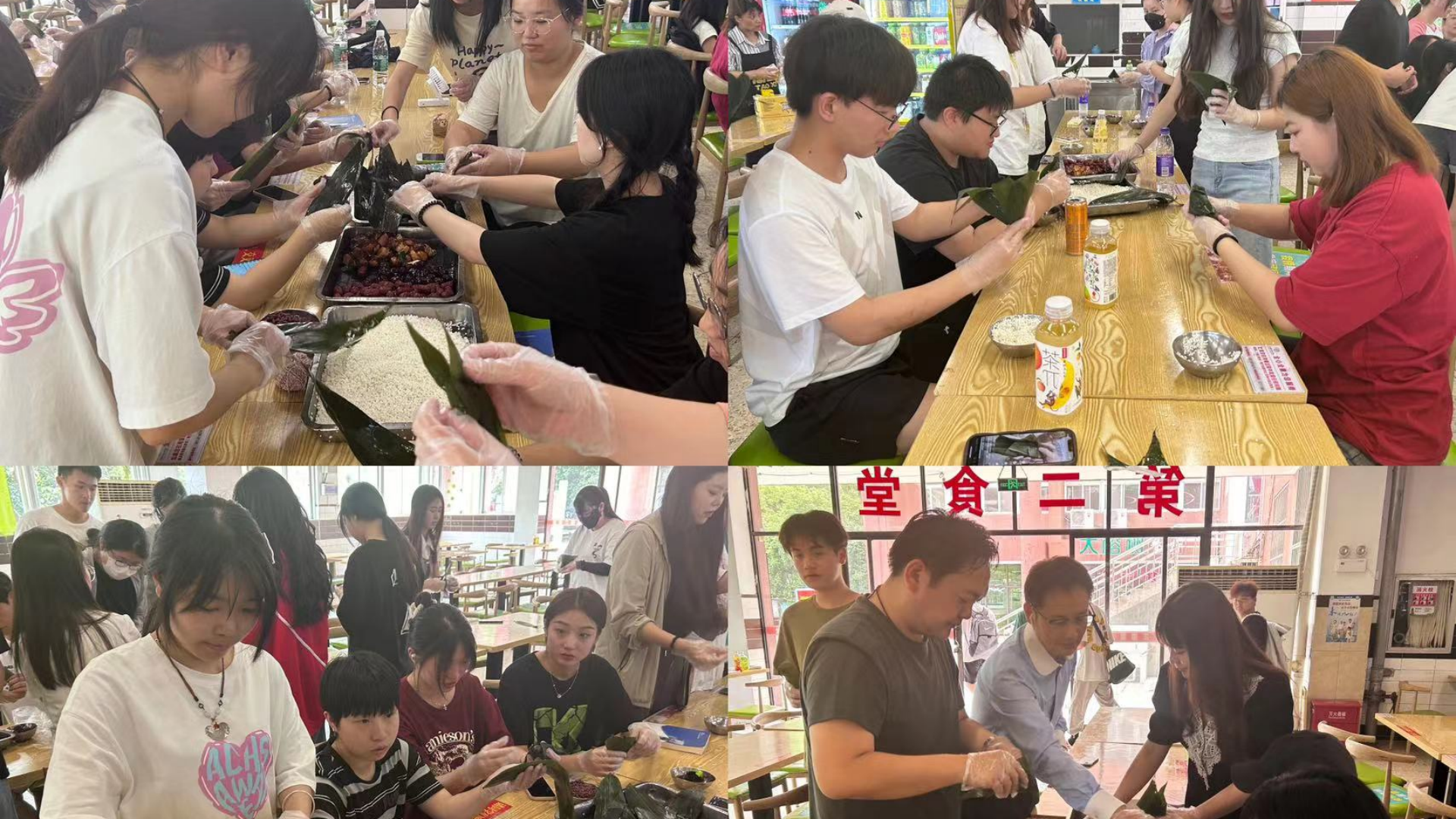 由于经验不足,学生们一开始出现了漏米、包住这头,裹不住那头等情况,但大家不气馁,在老师们的指点下,渐渐摸索出门道,一个个棱角分明的粽子在巧手下逐渐成型。大家兴致高昂,食堂里洋溢着欢声笑语,师生在欢乐融洽的节日氛围中,包了满满两大盘粽子。