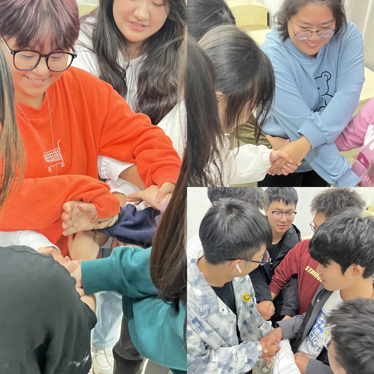 首先是活动环节,进行“解开千千结”小游戏。现场的所有同学六人一组,手牵手围成大圈,主持人站在圈外指挥。每个同学都要记住自己左右两边的人,听到主持人说解散的口令后开始随便相圈内走动,然后主持人会叫停,大家都得停止运动,然后找到刚开始在自己身边的人,保持原地不动,重新牵手。紧接着就是要想尽一切办法恢复到正常的牵手状态。同学们绞尽脑汁,团结协作,用尽一切办法解开结。这个游戏拉近了大家心的距离,促进了彼此之间的熟悉和沟通,增进了相互之间的理解和信任,同时也培养了同学们的组织和协作能力,营造了互助协助的积极氛围。