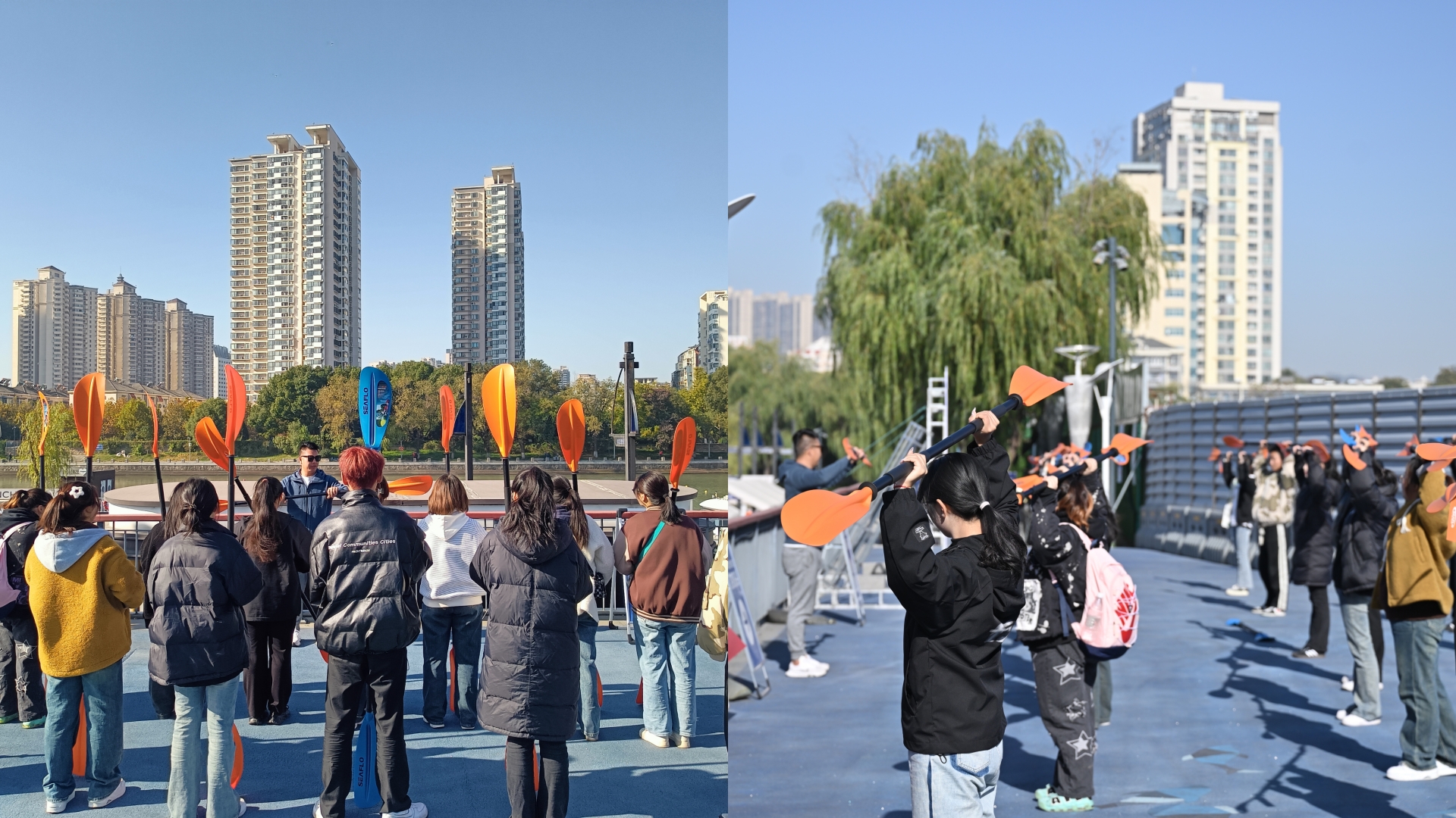 秋高气爽,风轻云淡,正是研学的好时节。为了让经管青年在行走中陶冶情操,在运动中锻炼身体,在体验中增长见识,在市旅游集团的邀约下,11月19日,经管系文体部带领学生赴水木秦淮码头开展“皮一下,也艇好”皮划艇研学活动。