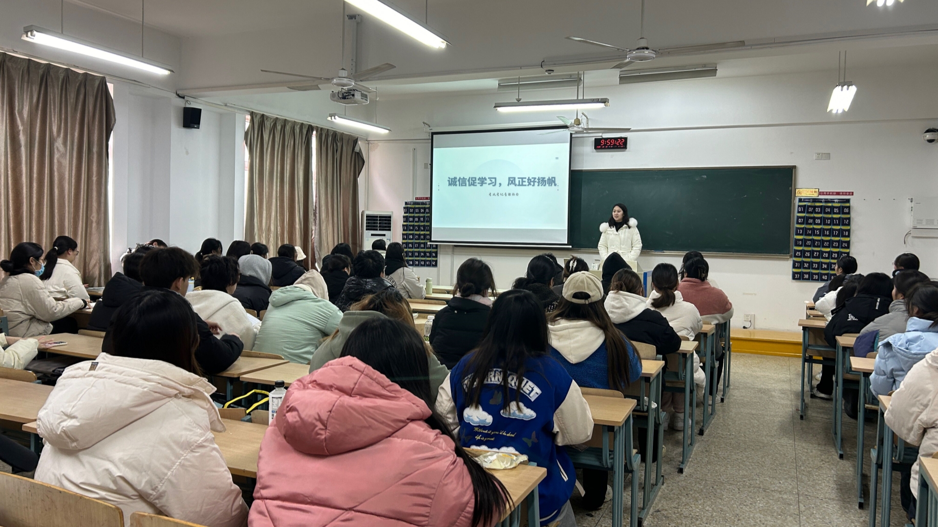 12月14日,临近大学生英语三级、四级考试,辅导员倪冰慧开展“诚信促学习,风正好扬帆”考风考纪教育班会,22级大数据与会计、国际经济与贸易专业报考学生参会。