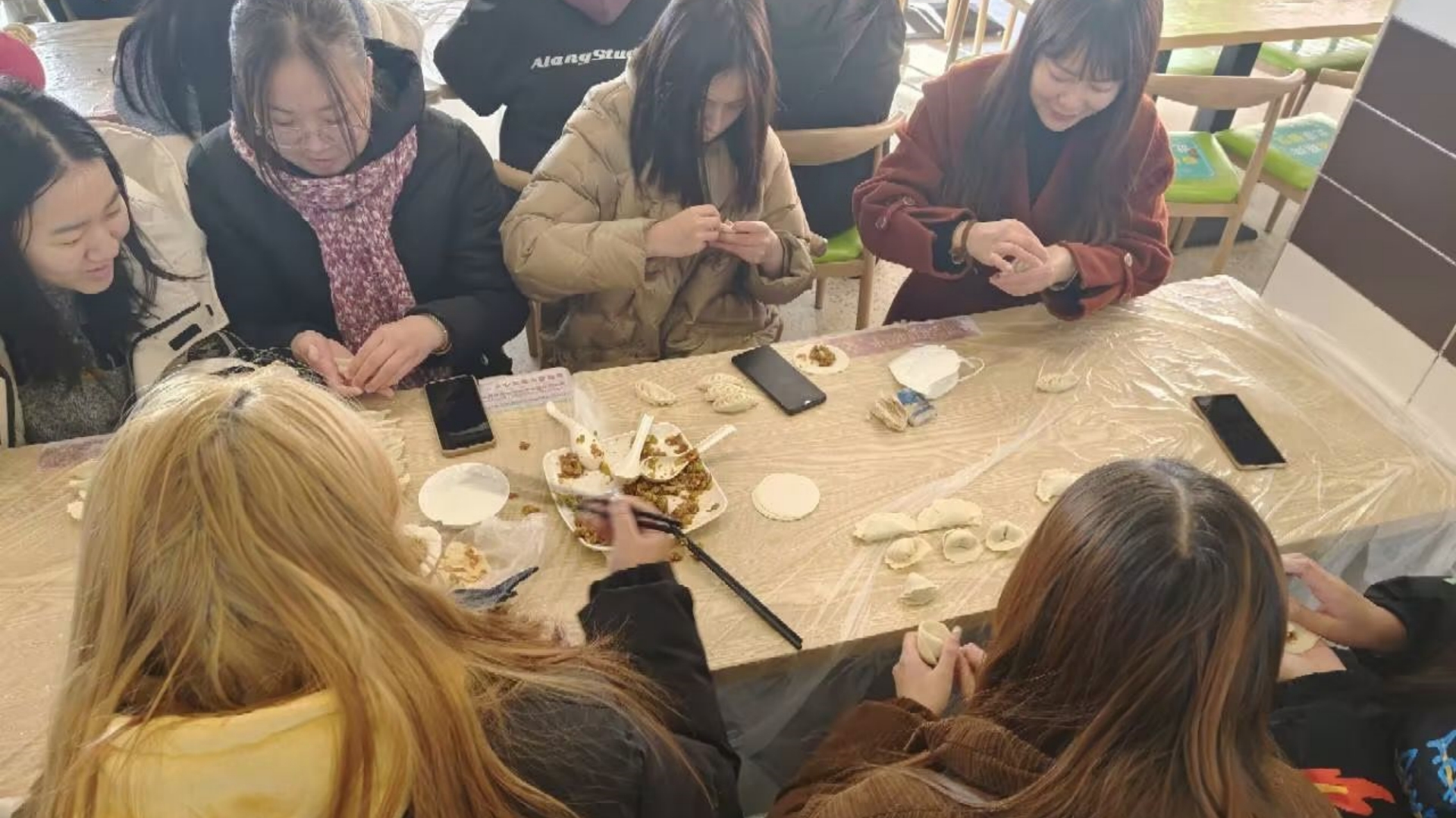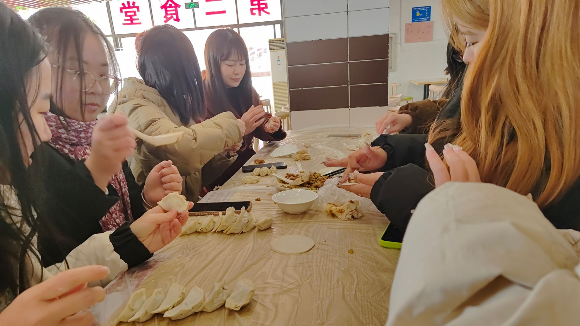 活动现场,食堂工作人员为大家准备了饺子皮和饺子馅。随后师生们其乐融融,开始包饺子,大家分工协作、井然有序,大家托住饺子皮、取一筷子饺子馅、捏好饺子皮,一排排个性十足饺子就诞生了。大家相互之间传授包饺子的经验,在欢乐、温馨的气氛中大显伸手,充分展示自己的手艺。会包的同学们跃跃欲试,充分展现了自身高超的技术;手法生疏的同学们也不甘示弱,在向“熟练工”们请教之后,展开想象力,包出了造型各异的饺子。