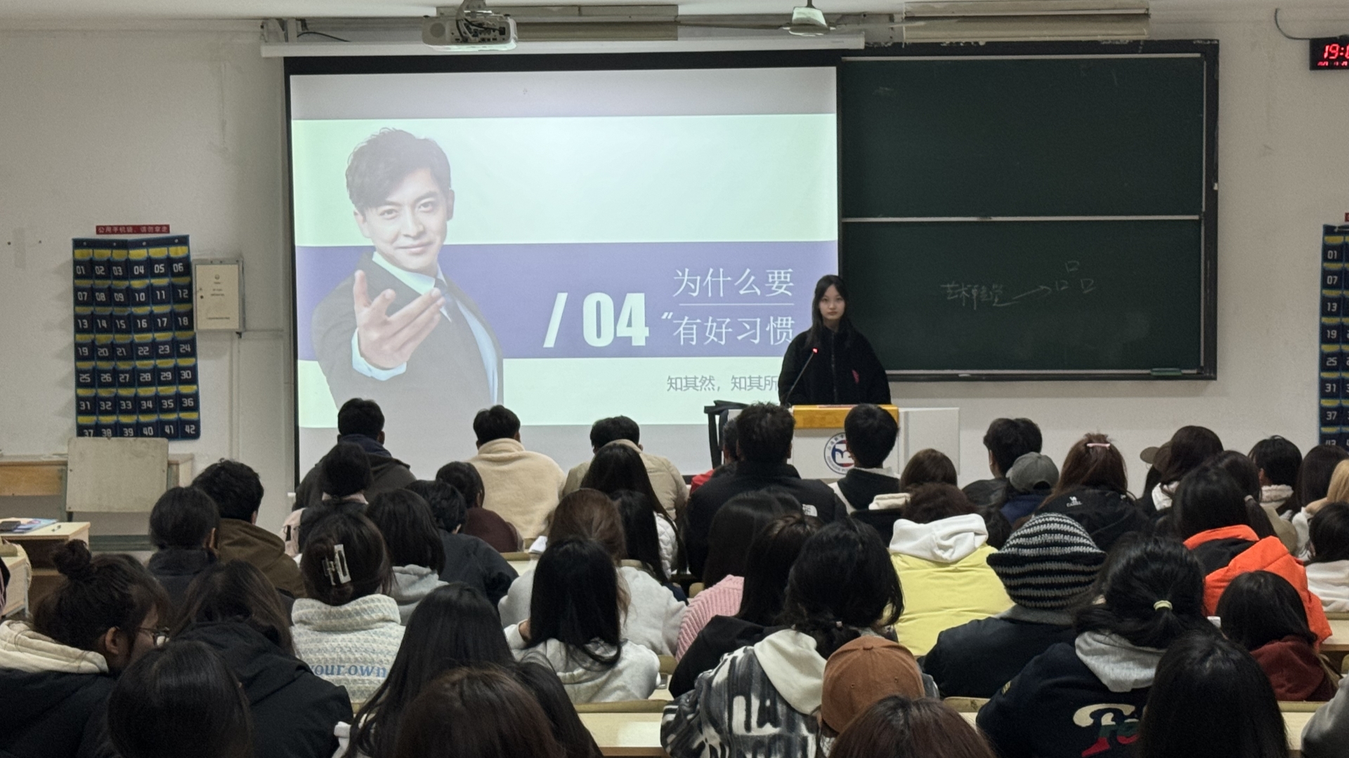 其次会计4班学习委员张思涵给大家列举了好习惯的第一步:明确目标,并且用了罗曼·罗兰的名言警句:“大部分的人在二三十人就死去了,因为这个年龄,他们只是自己的影子,此后的余生则是在模仿自己中度过,日复一日,更机械,更装腔作势地重复他们在有生之年的所作所为,所思所想,所爱所恨。”来告诫大家好的习惯受益终生。