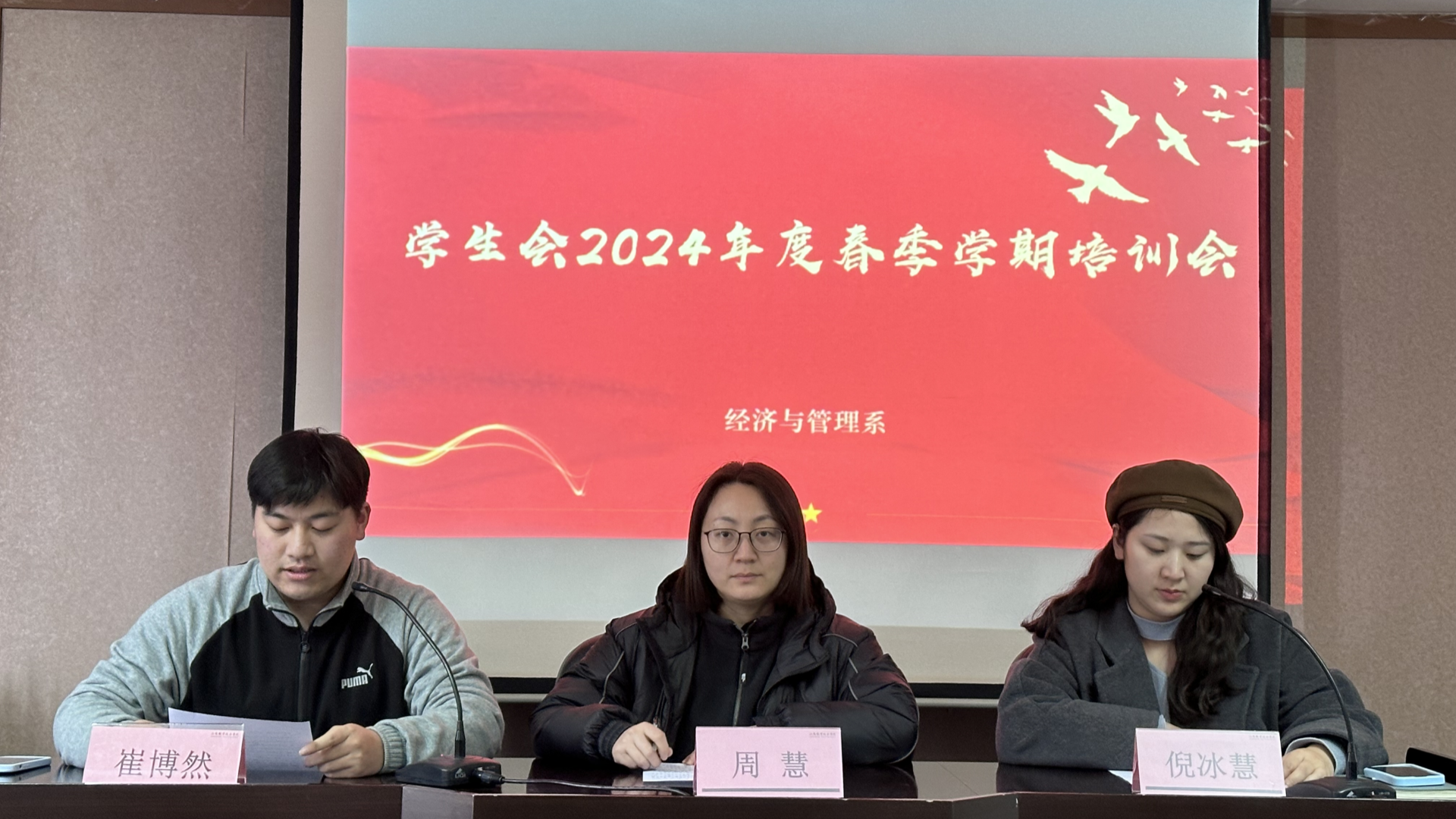 为深入学习宣传贯彻党的二十大精神,持续巩固学生会组织深化改革成果,切实增强学生会组织思想政治工作能力和水平,3月8日中午,经济与管理系在7508会议室召开2024年度学生会春季培训会,党支部书记周慧、团总支书记倪冰慧、辅导员刘妍到场指导,经管系团总支学生会全体成员到场参会。