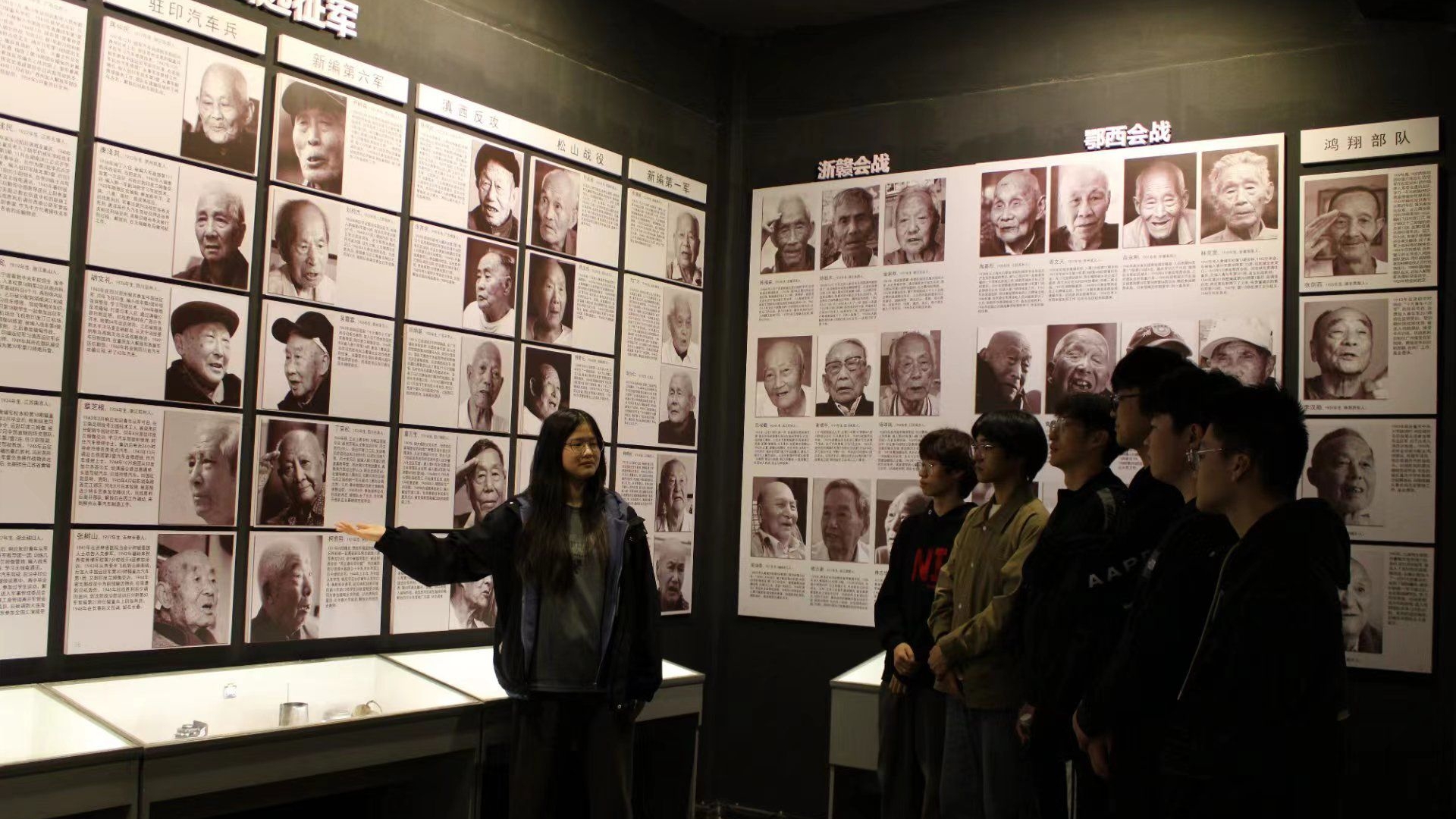 在“抗战文献”史料馆中,讲解员带大家参观了《1937南京记忆》、《不愿做奴隶的人们》、《抗战风云》、《抗战文献》、《抗战徽章》等几个主题的小展厅。围绕着小展厅的是一面陈列着数百位老兵的手印墙,手印上上附有籍贯与部队番号。这些老兵参加过淞沪会战、南京保卫战、台儿庄战役、武汉会战、长沙会战、远征缅甸等战役,他们是抗战历史的参与者、亲历者、见证者。这一张张手印就是一个个奋战在抗日战争一线的老兵不屈抵抗、顽强杀敌的真实写照和历史记录。另一面墙上则挂满黑色胶片,内为老兵们的寄语。同学们在先烈的手印与遗音前久久驻足,默然沉思。