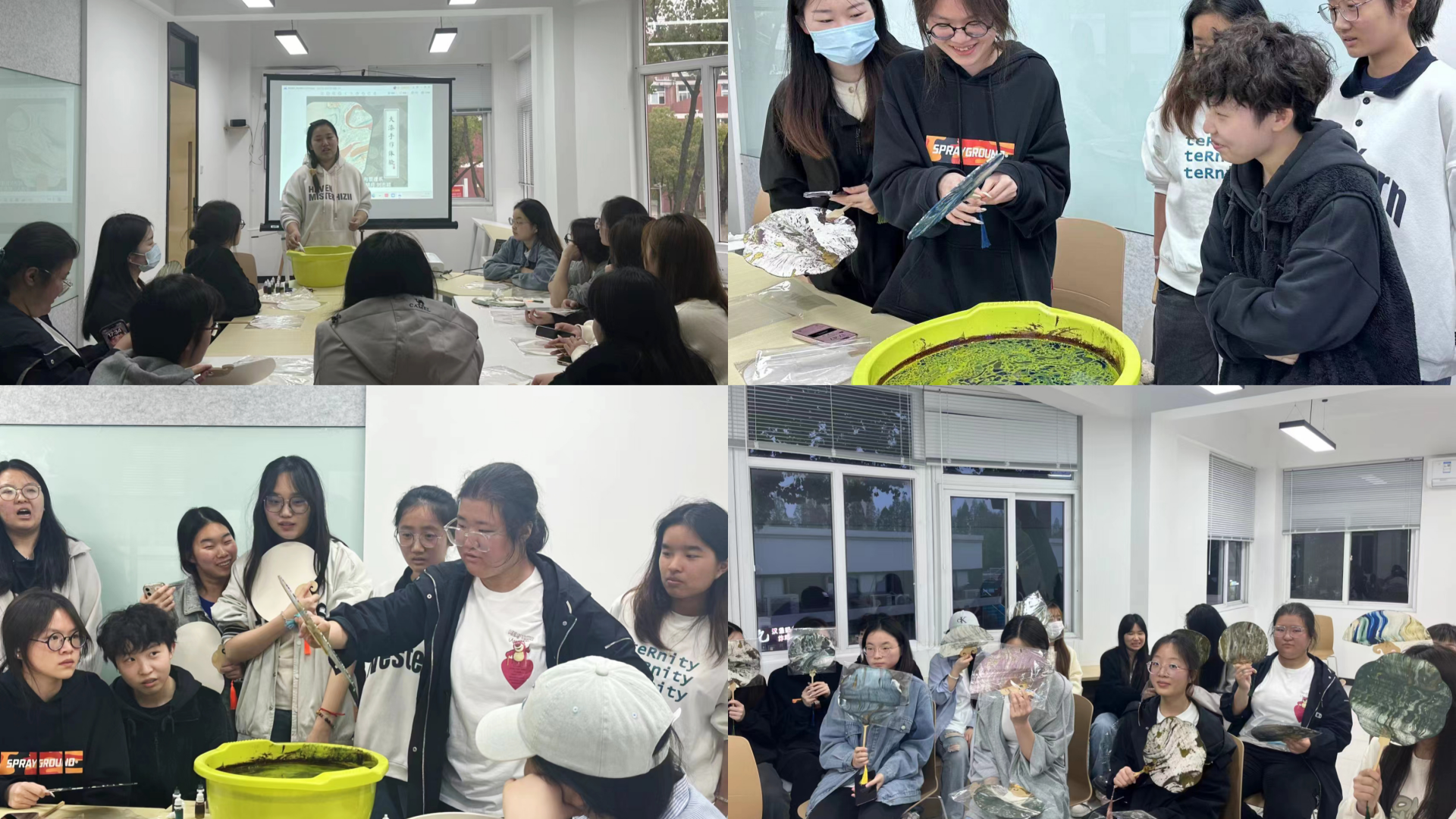 4月14日晚,非遗漆扇课里,大家将一同欣赏漂漆的灵动之美,亲手体验国家级非遗漆染工艺。主讲学生胡月、刘志颖,以传统工艺与现代设计相结合的教学方式,详细讲解了漆扇的起源、发展、制作流程及漆染工艺的独特魅力。在动手制作的过程中,团员青年们不仅深刻感受到了非遗文化的博大精深,更在扇面上绘制出了属于自己的创意与风格。一把把精美的漆扇在大家手中诞生,仿佛承载着传统文化的厚重与青春创意的活力,成为了一站式学生社区里一道亮丽的风景线。