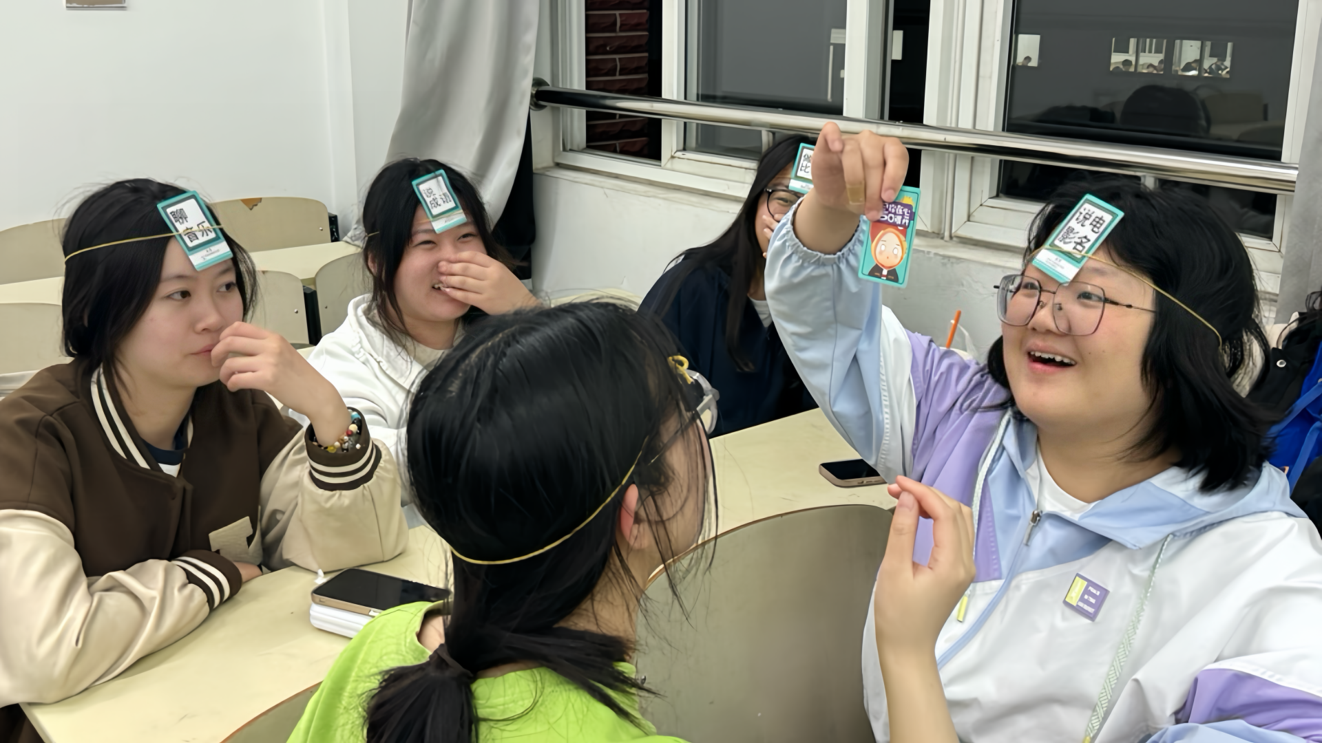本次活动在“害你在心口难开”的互动游戏中拉开帷幕。每位同学头上戴着一张写有内容的卡片,同学们需要巧妙引导他人说出与自己卡片上词语相关的内容,而不能直接说出卡片上的字。在游戏中,同学们纷纷展现出敏捷的思维和出色的表达能力,他们通过巧妙设问、机智回答,不仅成功引导对方说出卡片上的词语,还使大家更加积极地参与到晚自习这种集体学习活动中,增加了同学们之间的默契和友谊。