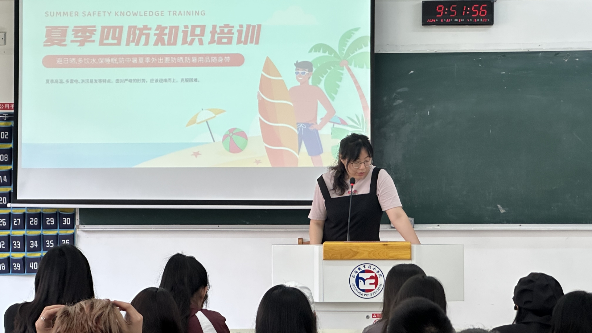 首先,刘妍从“防雷电”、“防洪防火”、“防溺水”、“防中暑”四个方面讲解了夏季四防的相关知识。她强调了“防雷电”的重要性,提醒大家在雷雨天气中避免在空旷地带或高处逗留,尽量远离金属物品和电器设备,以防雷击事件的发生。接着,刘妍讲解了“防洪防火”的要点,在夏季多雨季节,同学们要关注天气预报,做好防洪准备,避免前往低洼地带或洪水易发区域,她着重讲解了防火安全的重要性,提醒大家注意用电安全,不乱丢烟蒂,不私拉乱接电线,避免火灾事故的发生。随后,刘妍针对“防溺水”进行了详细阐述。她指出,夏季是溺水事故的高发期,同学们在游泳或戏水时要特别小心,不要在没有安全设施的地方游泳,避免单独行动,最好有家长或老师的陪同,她还突出了学习游泳技能的重要性,以便在紧急情况下能够自救。最后,刘妍介绍了“防中暑”的知识。她提醒大家,在高温天气下要注意补充水分和盐分,避免长时间暴露在阳光下,穿着透气轻便的衣物,保持室内通风和降温。如果出现中暑症状,要及时采取措施,如服用解暑药物、前往阴凉处休息等,必要时要寻求医疗救助。