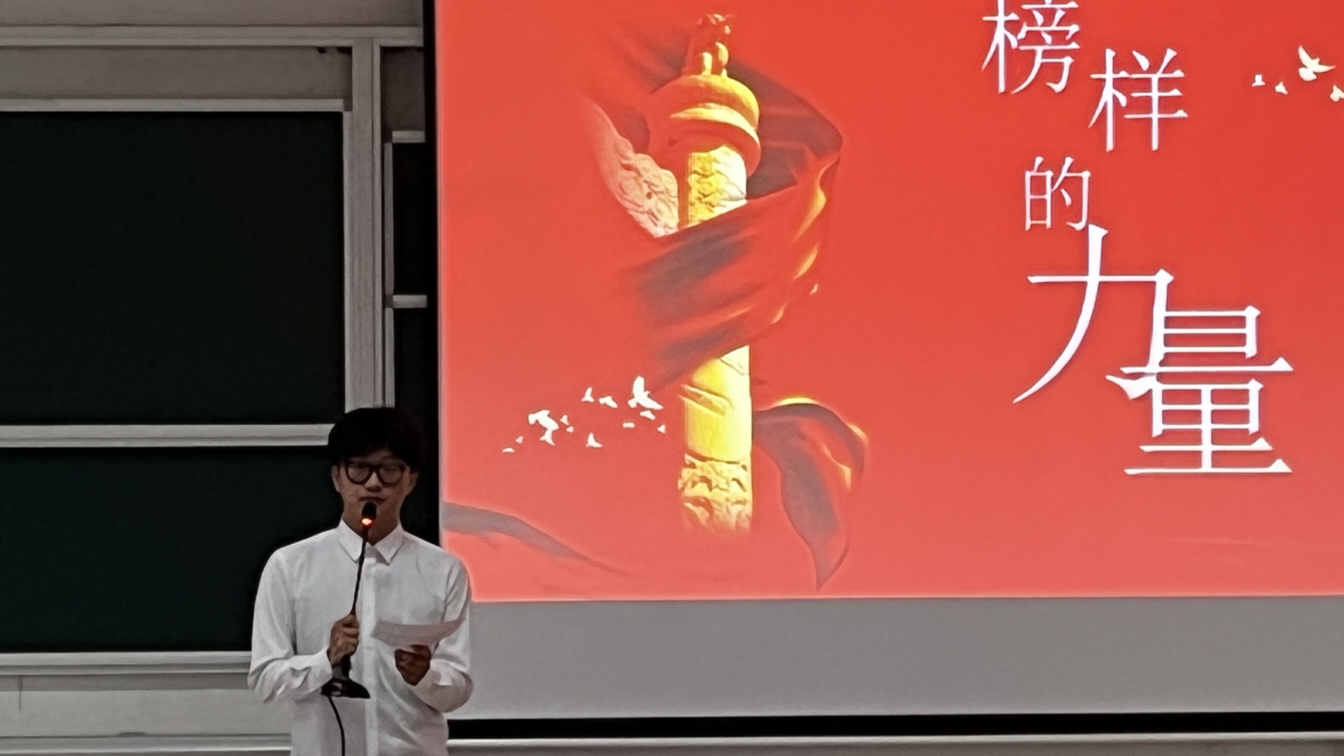呙竹云首先介绍了今天进行分享的张书铭同学的情况。他不仅成绩优异,专业成绩名列前茅,自学学完全部高数课程,还通过自身努力通过了初级会计证的考试,他还积极参加院系各项活动。她勉励广大同学向优秀学生看齐,追光而行,为实现梦想不懈奋斗。
