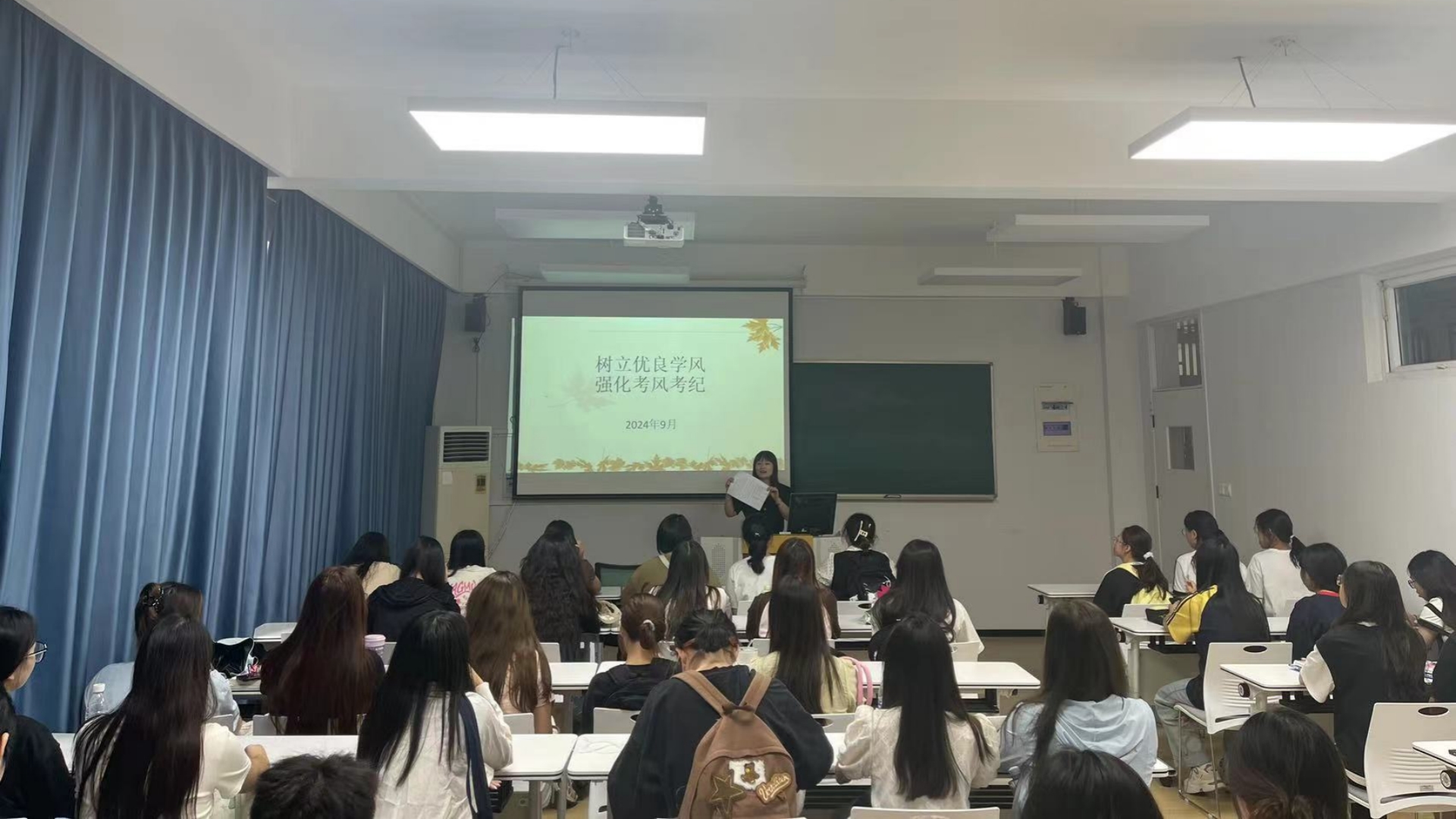 首先,呙竹云强调了学风建设的重要性,指出优良学风是提高学生综合素质、培养高质量人才的重要保障。她希望同学们能够树立正确的学习观念,珍惜大学时光,努力学习专业知识,不断提升自己的综合素质。接着,呙竹云带领全体学生再次认真学习了《学生手册》,重点讲解了第六章《考场规则》,全面严肃地指出了考试违纪的情形和后果。她强调,诚信是立身处事之本,希望大家明底线、知敬畏,以积极健康的心态从容面对考试,把功夫下在平时,切莫抱有侥幸心理,自觉做到诚信考试,用实际行动捍卫公平之尺。