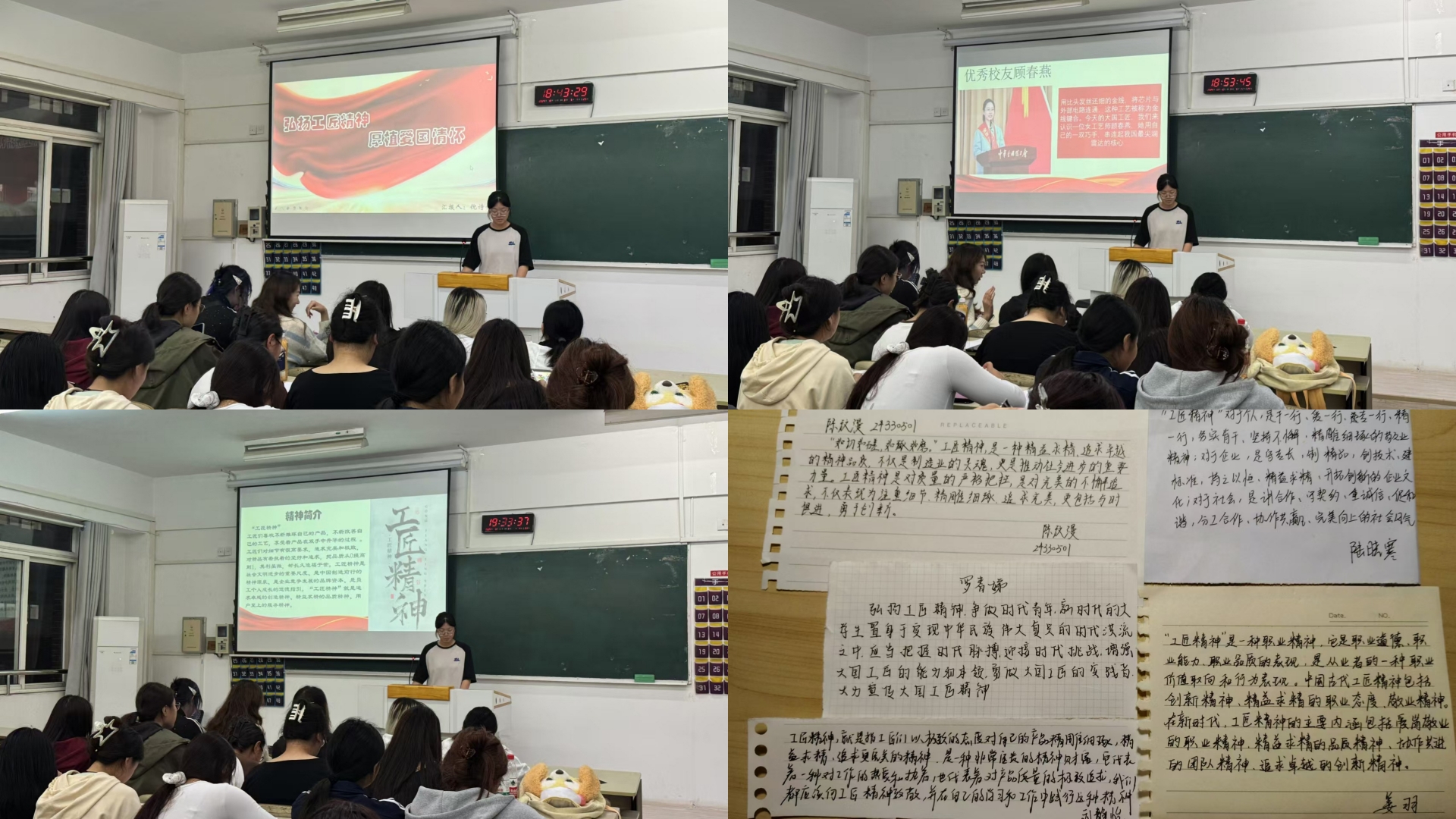 活动开始,副班长倪诗倩引领全班同学观看了大国工匠顾春燕的纪录片。随着视频中顾春燕以卓越技艺和不懈追求展现出的工匠精神,教室里充满着敬佩与思考的氛围。倪诗倩适时暂停影片,详细阐述了工匠精神的精髓——敬业、专注、精益、创新,并鼓励同学们将这份精神内化于心。班会尾声,同学们纷纷响应号召,提笔记录下自己对工匠精神独到而深刻的理解,字里行间流露出对未来职业生涯的期许与决心。
