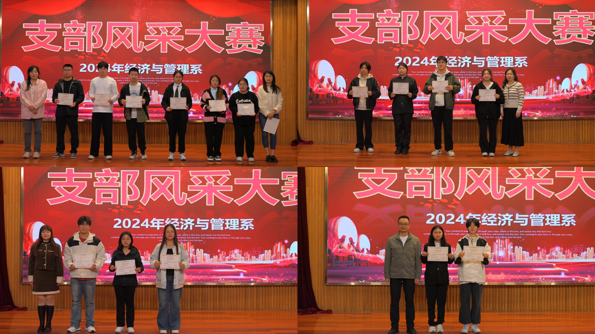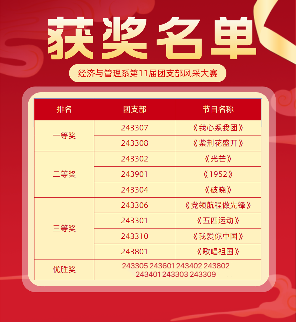经过一番激烈的角逐,最终评选出了一等奖两名、二等奖三名、三等奖四名以及优胜奖七名。获奖的团支部不仅在比赛中表现得极为出色,在平日的学习、生活、工作中也始终积极履行着自己的职责和使命。获得一等奖的两个团支部将代表经济与管理系参加学院第十一届团支部风采大赛决赛。