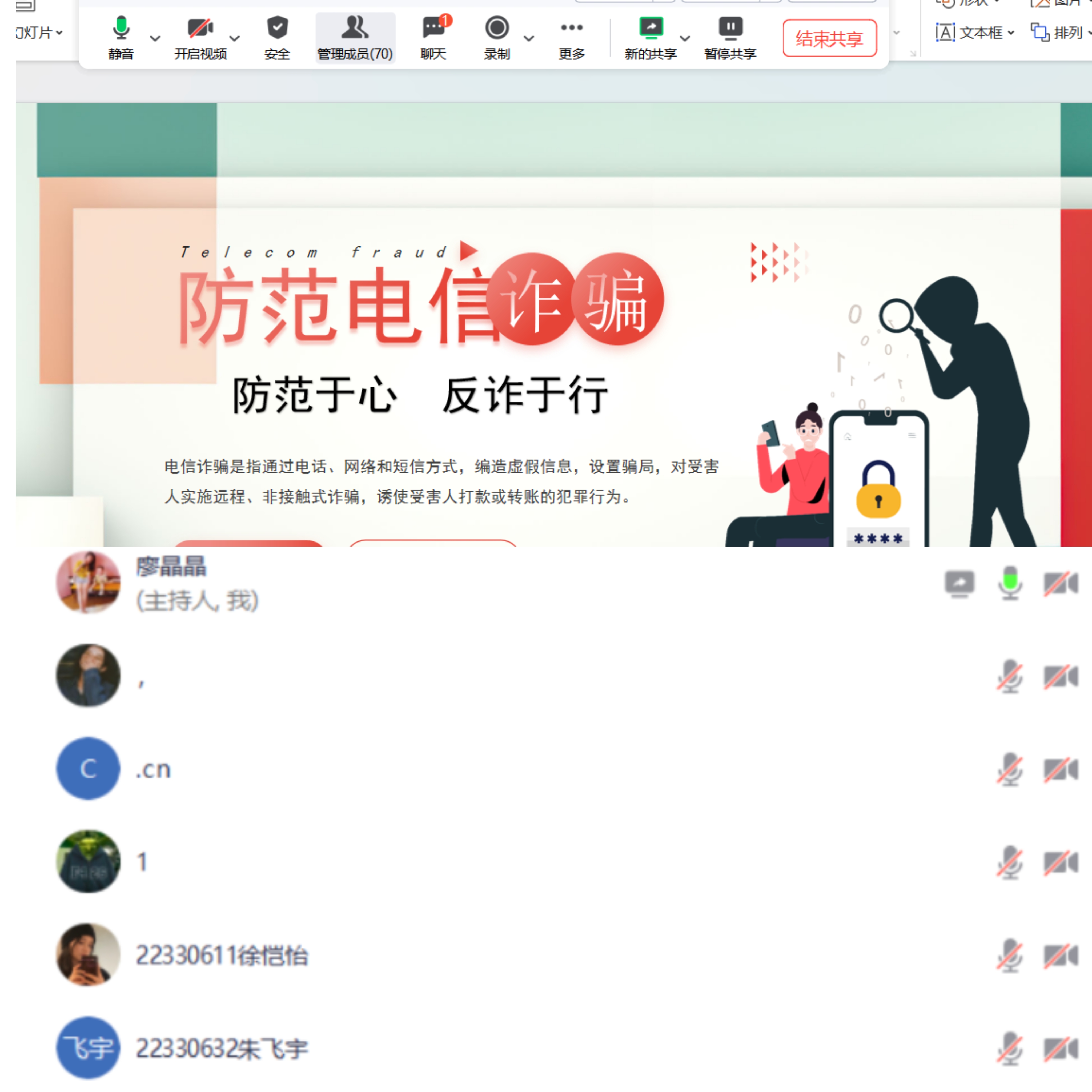11月15日大三辅导员通过开展线上专题讲座、主题班会、线上视频观看等形式,深入浅出地向学生普及网络诈骗的常见类型、手法及防范措施。同时,利用微信公众号、反诈观影等多种形式,广泛传播反诈知识,通过详细讲解案件经过、诈骗手法、受害者心理及防范措施,让校外实习学生深刻认识到网络诈骗的严重性和复杂性,增强了学生的安全意识和自我保护能力。