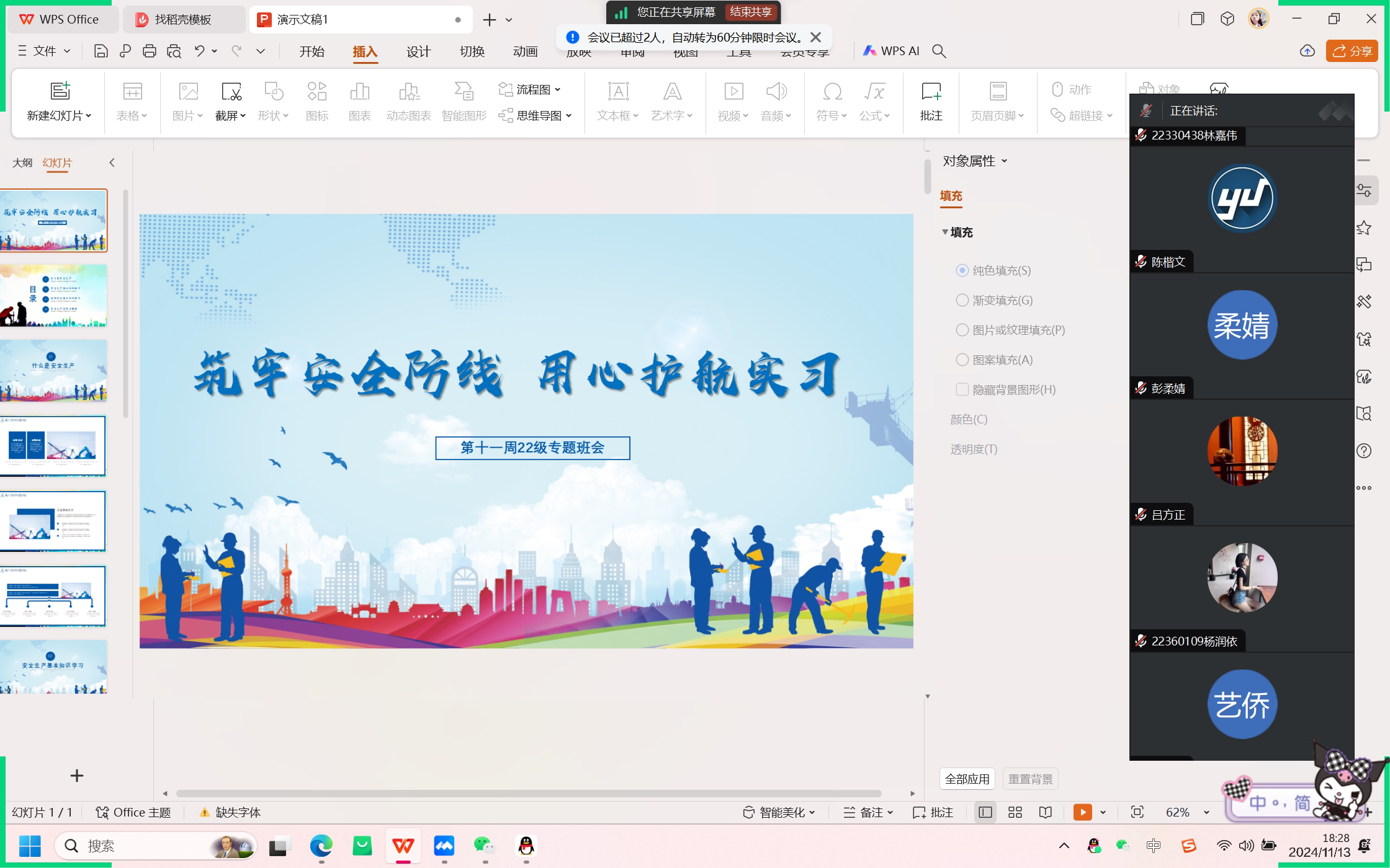 为全面做好大三实习学生的安全教育和管理工作,提高学生的自我防范意识,保障学生安全稳定工作,11月13日,辅导员倪冰慧召开了主题为“筑牢安全防线,用心护航实习”线上班会。