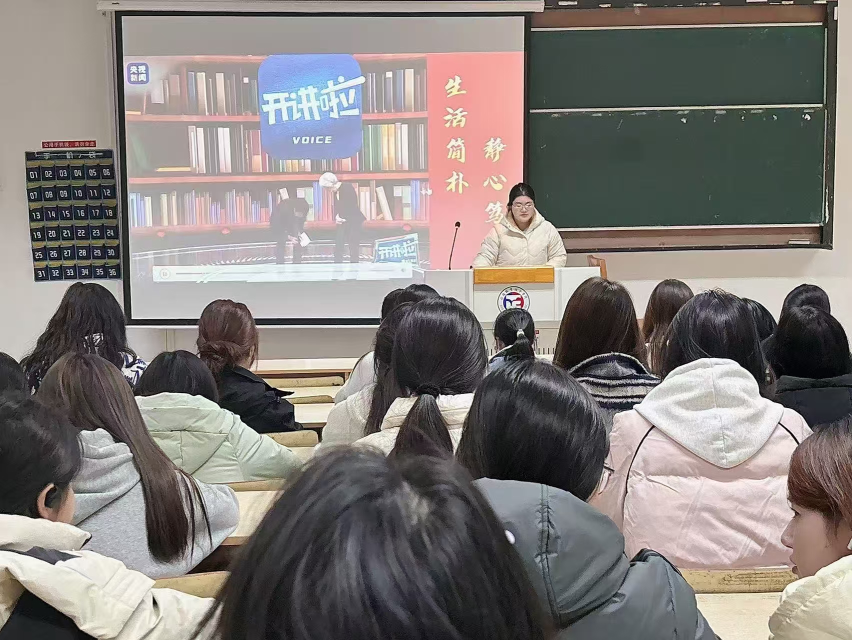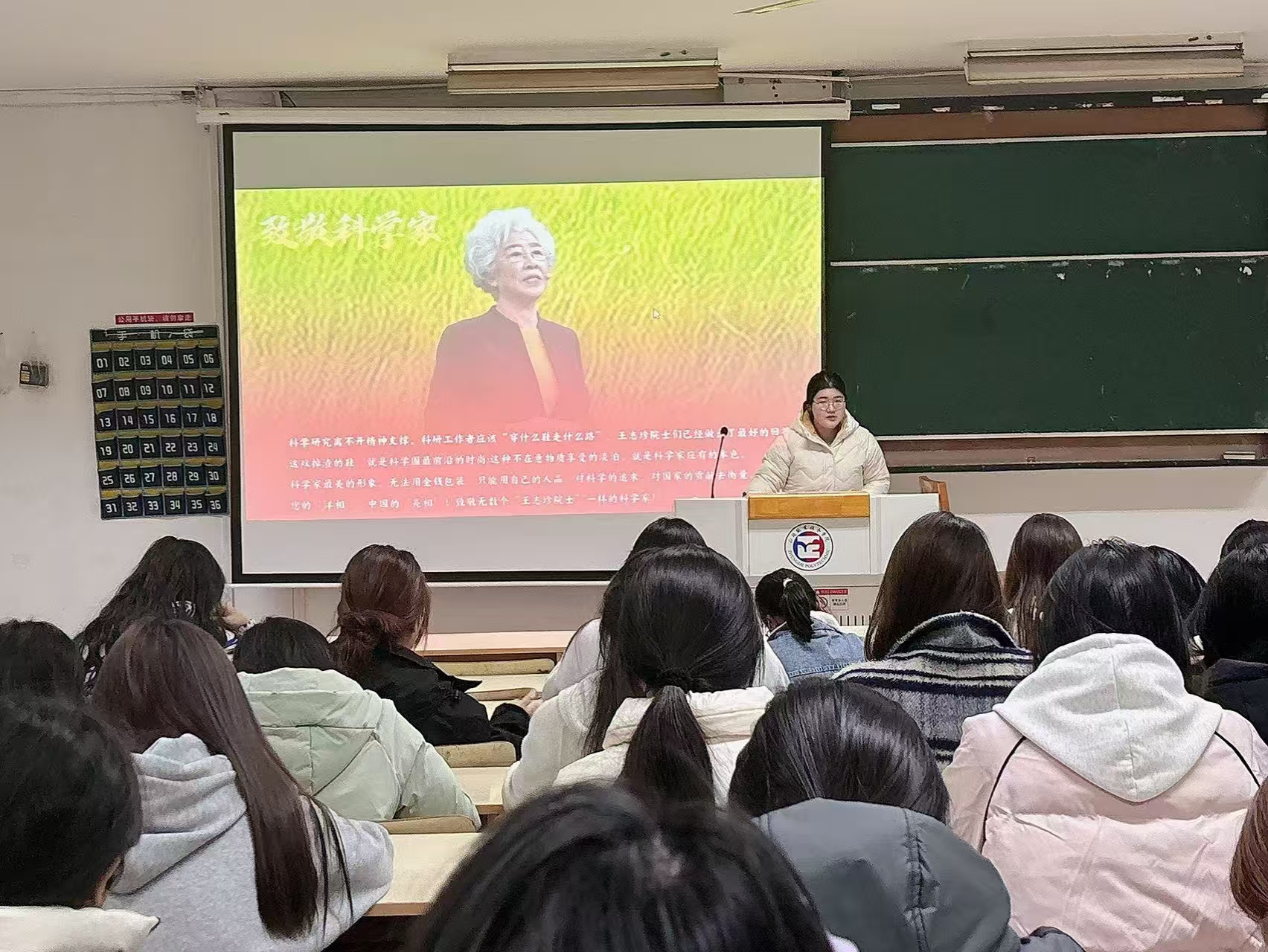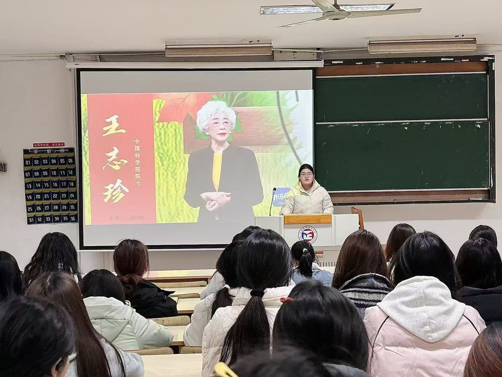 班会开始,赵辰悦通过ppt向大家讲述了王志珍院士的辉煌人生和非凡成就。王志珍院士不仅在生物化学领域取得了卓越的研究成果,更以其坚定的科学信念和不懈的探索精神,成为了无数学子心中的楷模。接着又通过生动的语言和丰富的资料,向同学们展示了王志珍院士在科学道路上的坚韧与执着,以及她对国家和社会的无私奉献。为了更直观地让同学们感受到王志珍院士的魅力,赵辰悦播放了王志珍院士在《开讲啦》节目中的精彩片段。视频中,王志珍院士用朴实无华的语言,分享了自己的科研经历和人生感悟,让同学们深受启发。团支书陈玟漫感慨地说:“王志珍院士的事迹让我深刻体会到,科学不仅是对未知的探索,更是对梦想的坚守,她的精神将激励我在未来的道路上不断前行。”