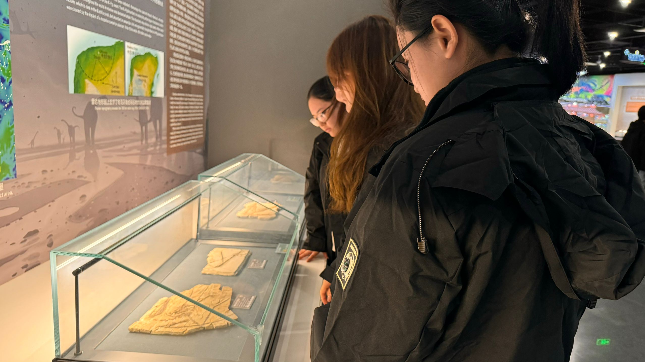 然后,同学们来到了专题展览区,这里展示了澄江动物群、恐龙天地、微观世界、生物登陆等珍贵化石,每一块化石都在诉说着属于它们的年代和故事。一整面墙的海百合化石、加拿大的宝石级菊石化石、马银杏化石等,让同学们仿佛穿越了时间的鸿沟,感受到了生命的无限可能和古生物学的魅力。