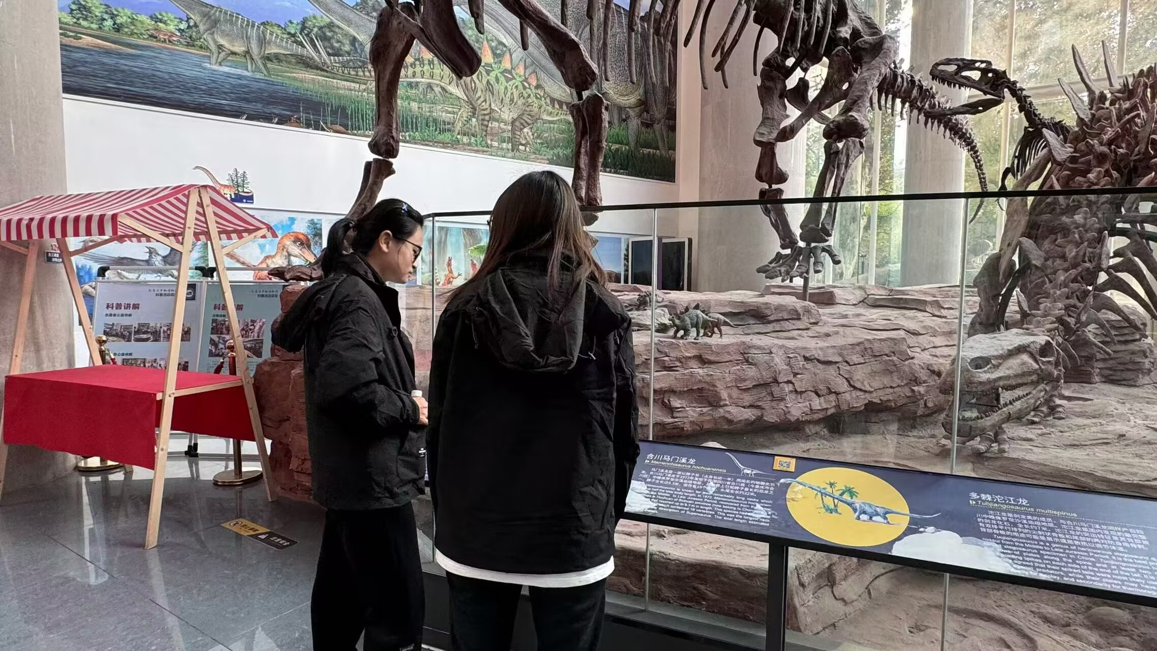 活动伊始,同学们首先被博物馆门厅内的一座近乎两层楼高的恐龙骨架造型所震撼,那是庞大的“马门溪龙”,它高高矗立在大厅中央,四只翼龙模型盘旋其中,让人仿佛置身于侏罗纪世界中。讲解员为大家介绍了博物馆的主题——“演变中的地球,进化中的生命”,并详细讲述了从寒武纪“生命大爆发”到第四纪人类出现的过程,让同学们对生命起源和演化有了初步的认识。