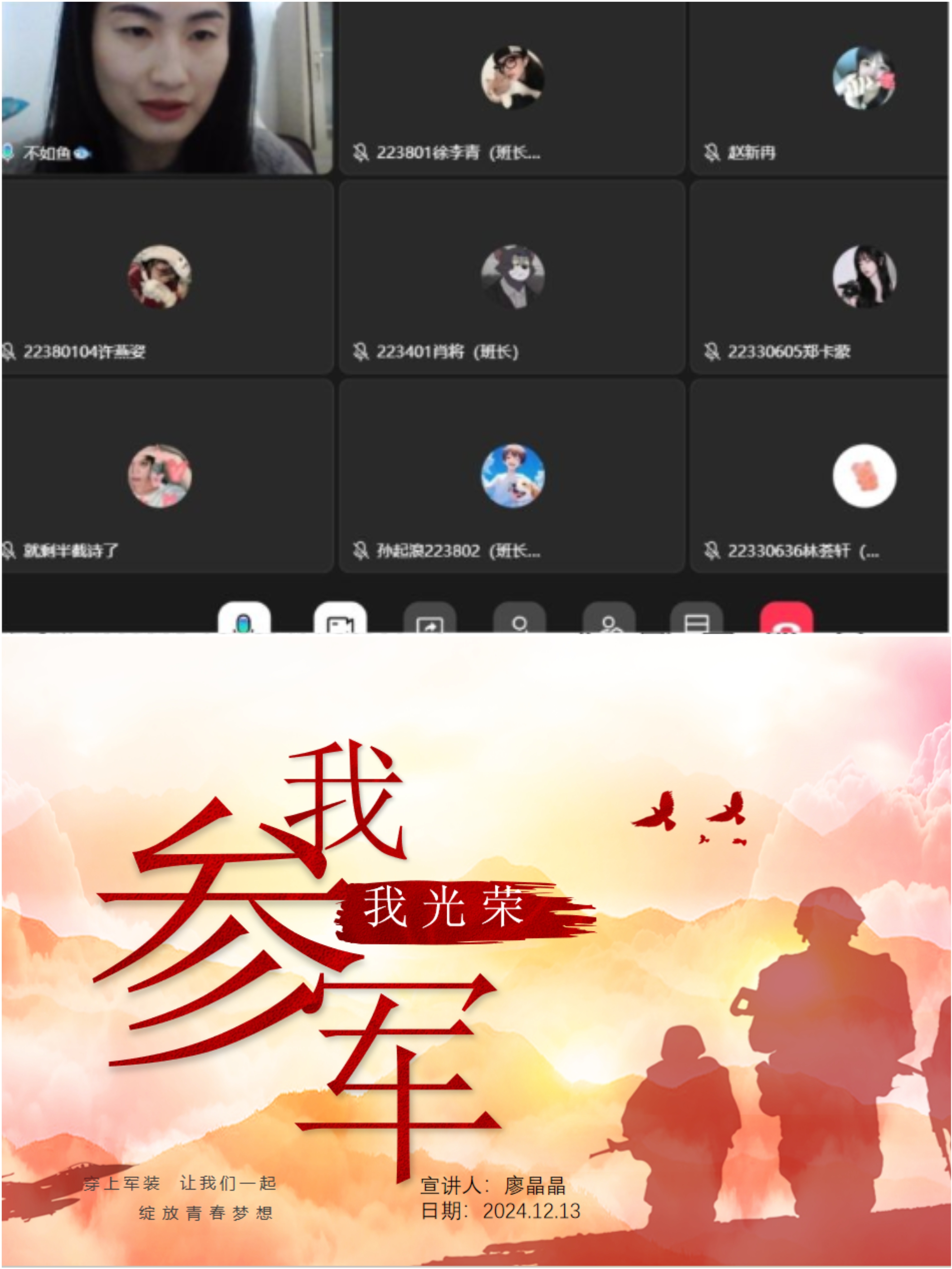 为弘扬爱国主义精神,激发广大青年投身国防建设的热情,我系积极组织2025届学生开展应征征兵宣传工作,2024年12月13日中午,辅导员廖晶晶老师面向所有毕业班学生召开了线上“优秀青年立志从军,热血男儿精诚报国”征兵宣传活动。
