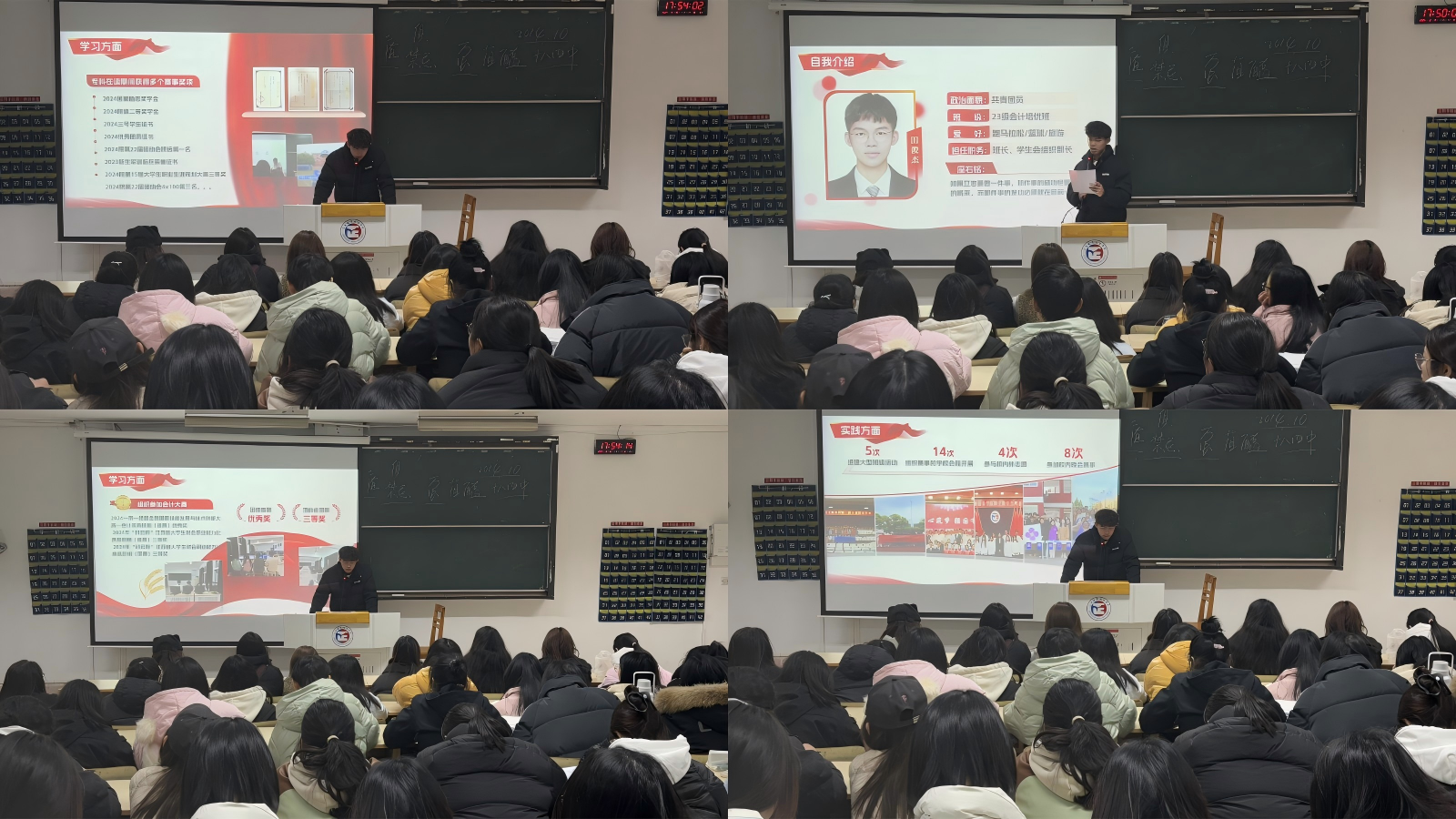 宣讲会上,田俊杰分享了自己在学业上的长远规划与具体实施步骤,强调了制定合理的学习计划、保持高效的学习状态以及定期反思与调整的重要性。接着,田俊杰向大家展示了入校以来参与的各类活动与所获奖项,从学术竞赛到社会实践,从志愿服务到社团活动,每一项经历都见证了他的成长与蜕变,他在比赛中遇到的挑战与克服困难的经历,锻炼了自己的团队协作与领导能力。在谈及转本的准备时,田俊杰更是慷慨分享了自己的备考策略与心态调整方法,强调了提前规划、分阶段备考的重要性,并分享了自己如何克服焦虑、保持积极心态的经验。田俊杰的分享让在场的每一位同学都受益匪浅,对未来充满了信心与期待。