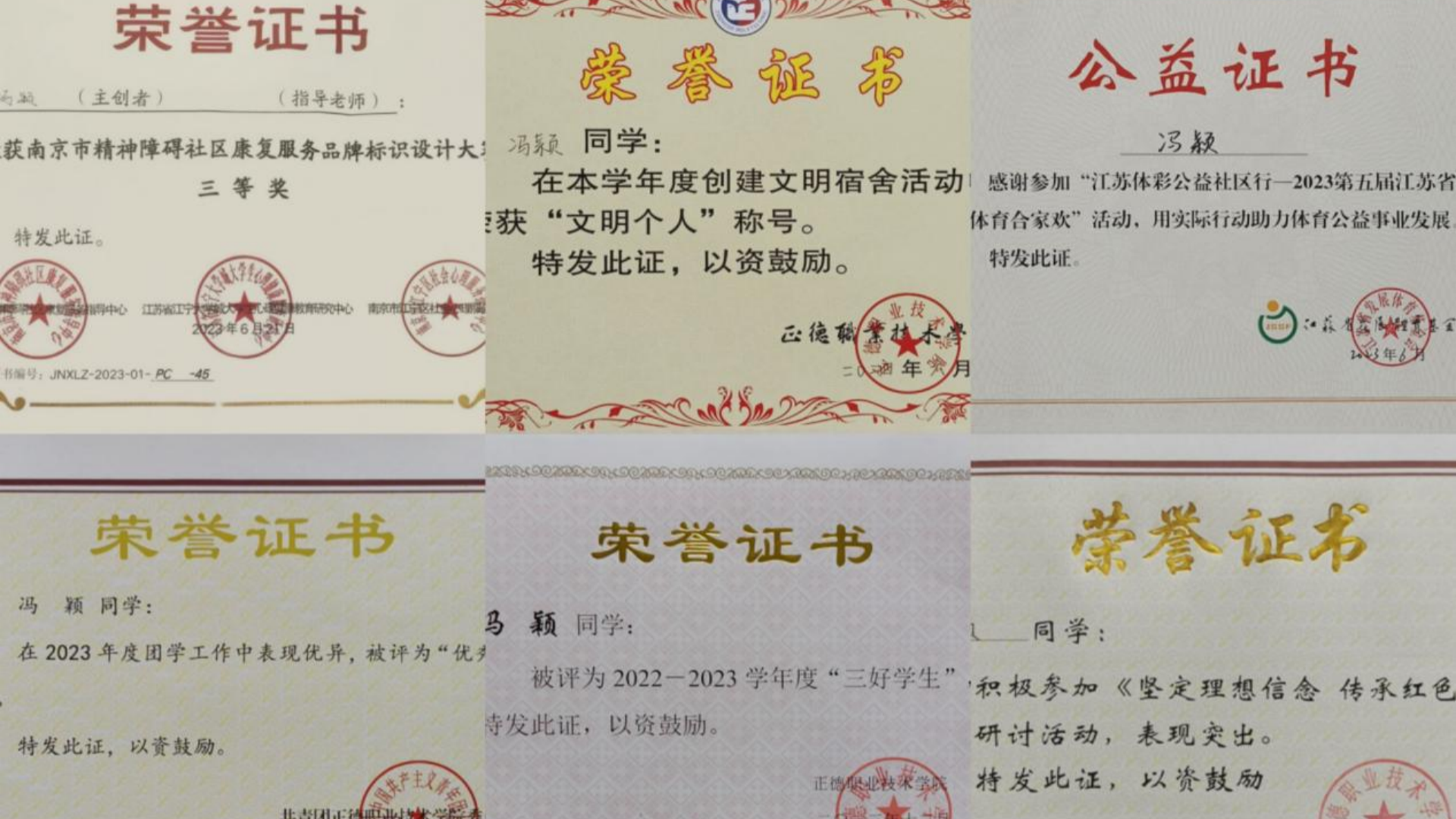 2022-2023年获“国家励志奖学金”、“三好学生”、第五届江苏省社区体育合家欢活动“优秀青年志愿者”、经济与管理系“优秀青年志愿者”、迎新生志愿活动“优秀青年志愿者”,2023年获南京市精神障碍社区康复服务品牌标识设计大赛三等奖等荣誉。