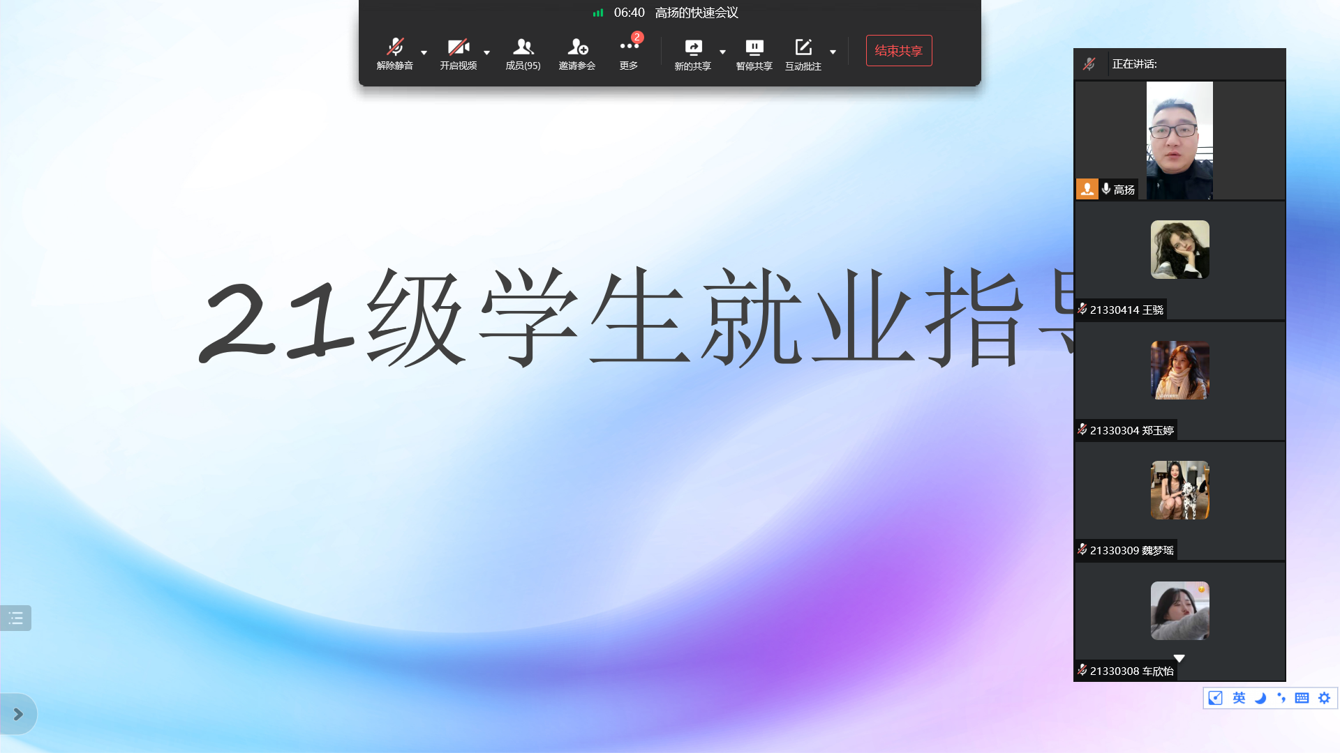 为加快推进2021届毕业生就业指导工作,为毕业生提供更好的就业指导服务,2023年11月14日下午6点30分,经济与管理系辅导员高扬老师举办线上就业指导会议。本次指导包括简历的制作、笔试面试的技巧以及同学们在就业过程中可能会遇到的一系列问题,同时还解答了同学们关于就业的诸多困惑,为准毕业生们顺利就业奠定了坚实基础。