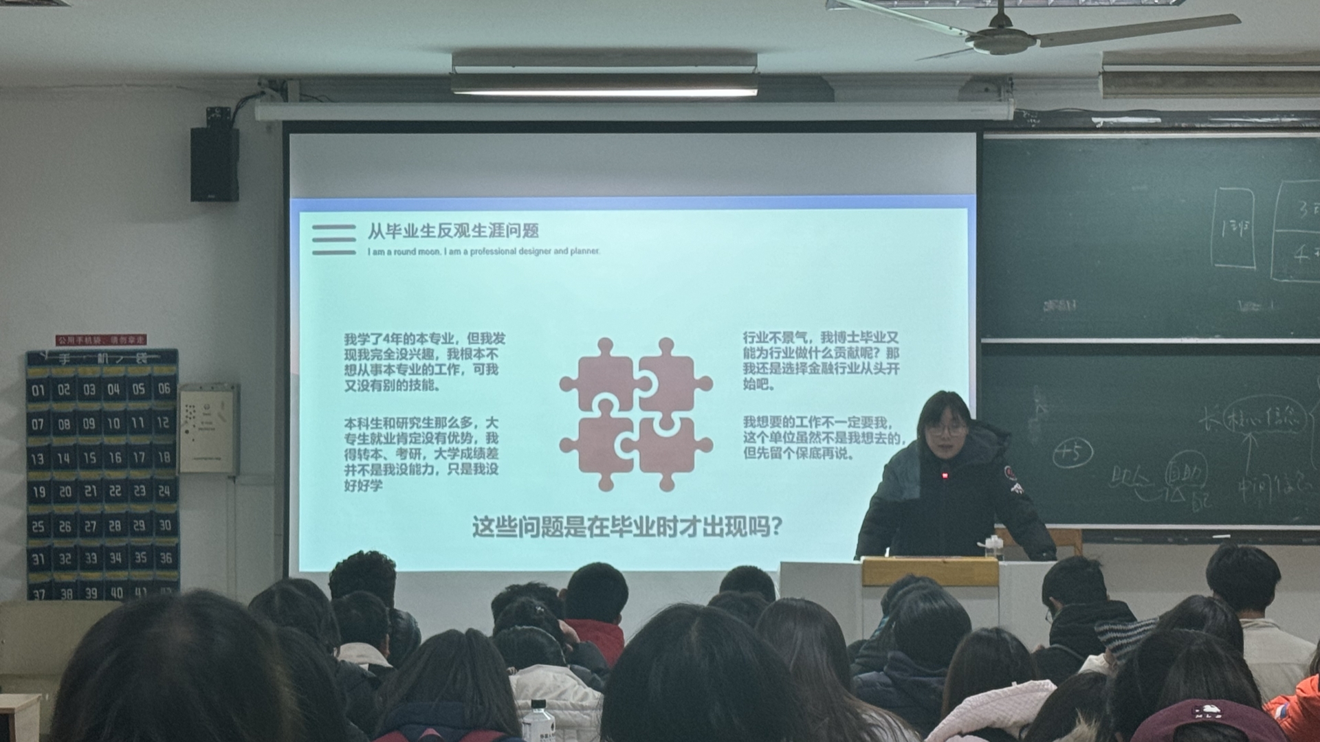 接着,刘妍从毕业生反观生涯问题,展示出一系列发人深省的例子,如“我学了4年的本专业,但我发现我完全没兴趣,我根本不想从事本专业的工作,可我又没有别的技能。”、“我想要的工作不一定要我,这个单位虽然不是我想去的,但先留个保底再说。”等等,进而提问“这些问题是在毕业时才出现的吗?”同学们陷入了沉思,对自己的职业规划产生疑惑。