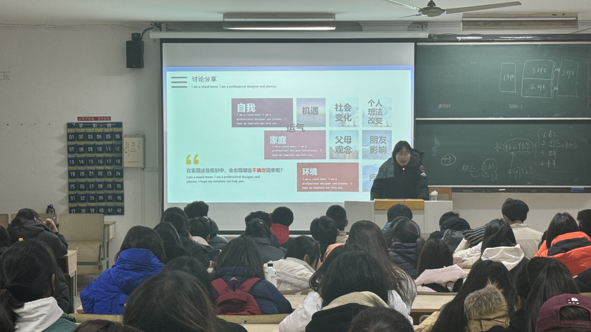 接下来进入到讨论环节,针对刚刚制定的规划,刘妍提问:“在实施过程中可以预想到哪些不确定因素呢?”同学们踊跃回答:“有父母观念的影响、有同学的影响、有机遇和运气的成分、也有疾病和家庭的因素”。刘妍进行总结,不确定因素包括个人因素、环境因素以及社会因素三类,其中个人因素是职业生涯规划的基础,环境因素有着间接或直接的影响,社会因素则具有着重要的影响。