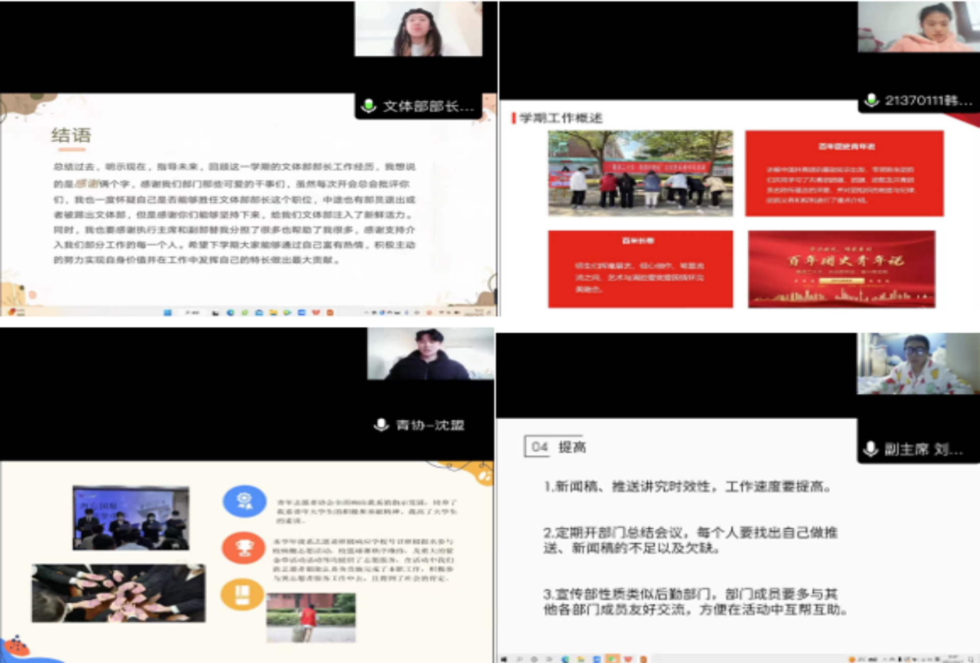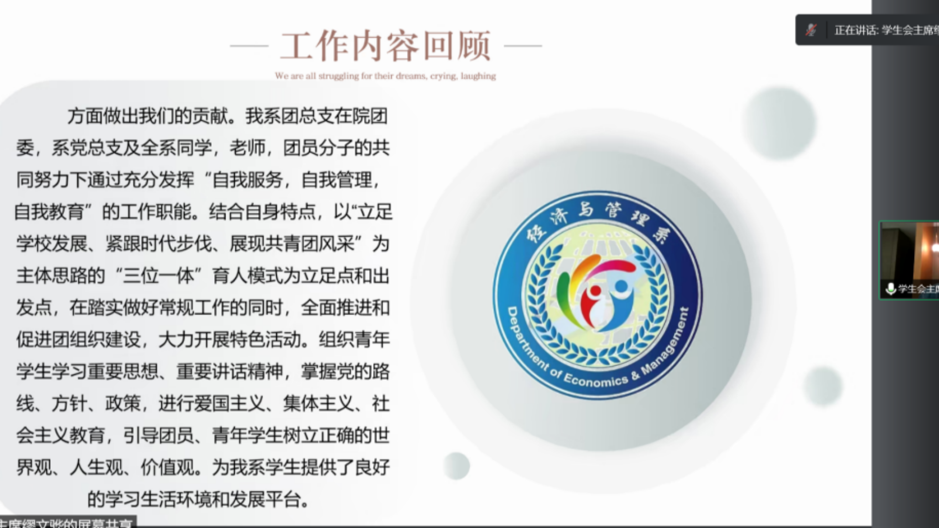 时至岁末,本学期也即将走向尾声,为宣传贯彻党的二十大精神,提高学生干部的责任意识、服务意识和大局意识,深化学生会改革落实述职评议工作,经管系于12月15日在腾讯会议开展了“经管系团总支 学生会述职评议会” 。经济与管理系团总支书记倪冰慧老师,团总支副书记、学生会主席团、各部门部长及全体成员参加会议。