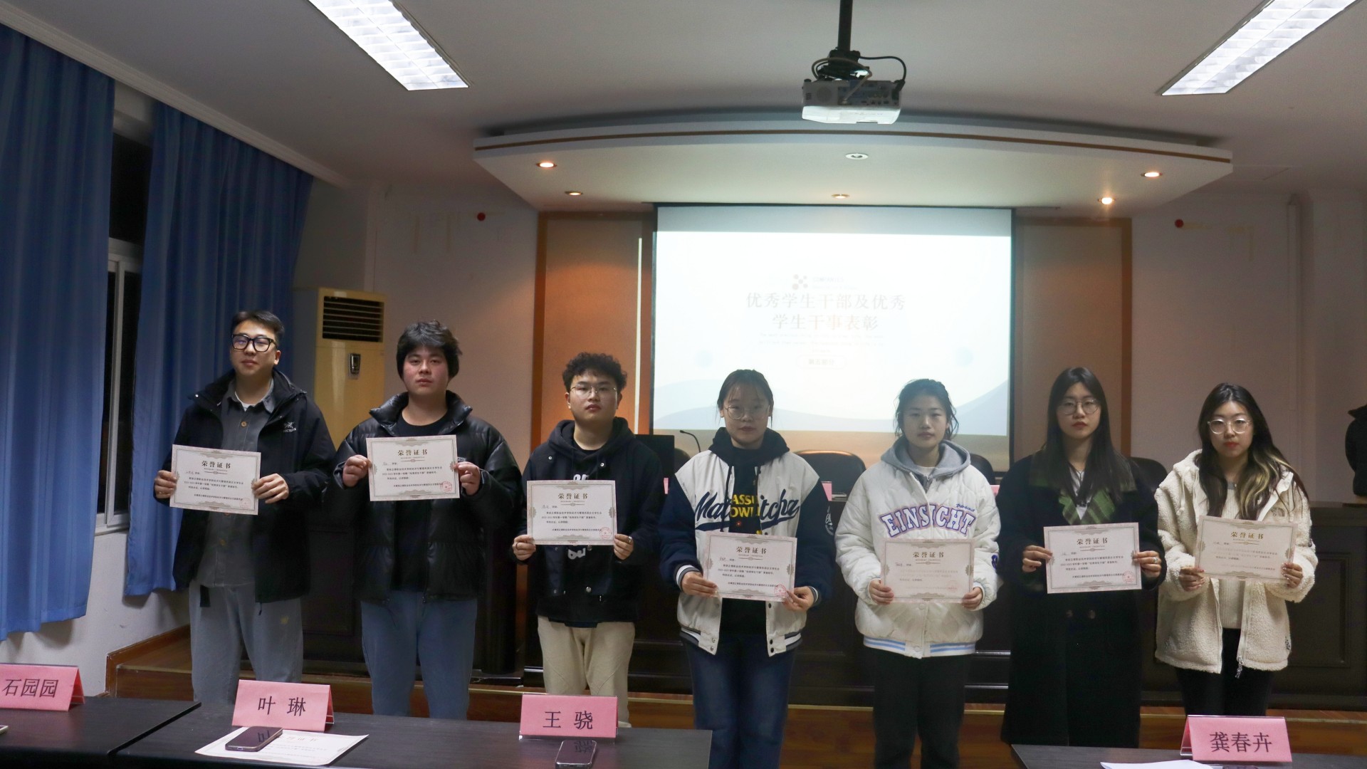 首先,学生会主席缪文骅对上学期工作进行了汇报总结,初步介绍了本学期重点工作,并宣布了2022-2023学年第一学期表彰名单,由党支部书记雷杨和团总支书记倪冰慧分别给“优秀学生干部”、“优秀部门”、“优秀学生干事”进行颁奖。