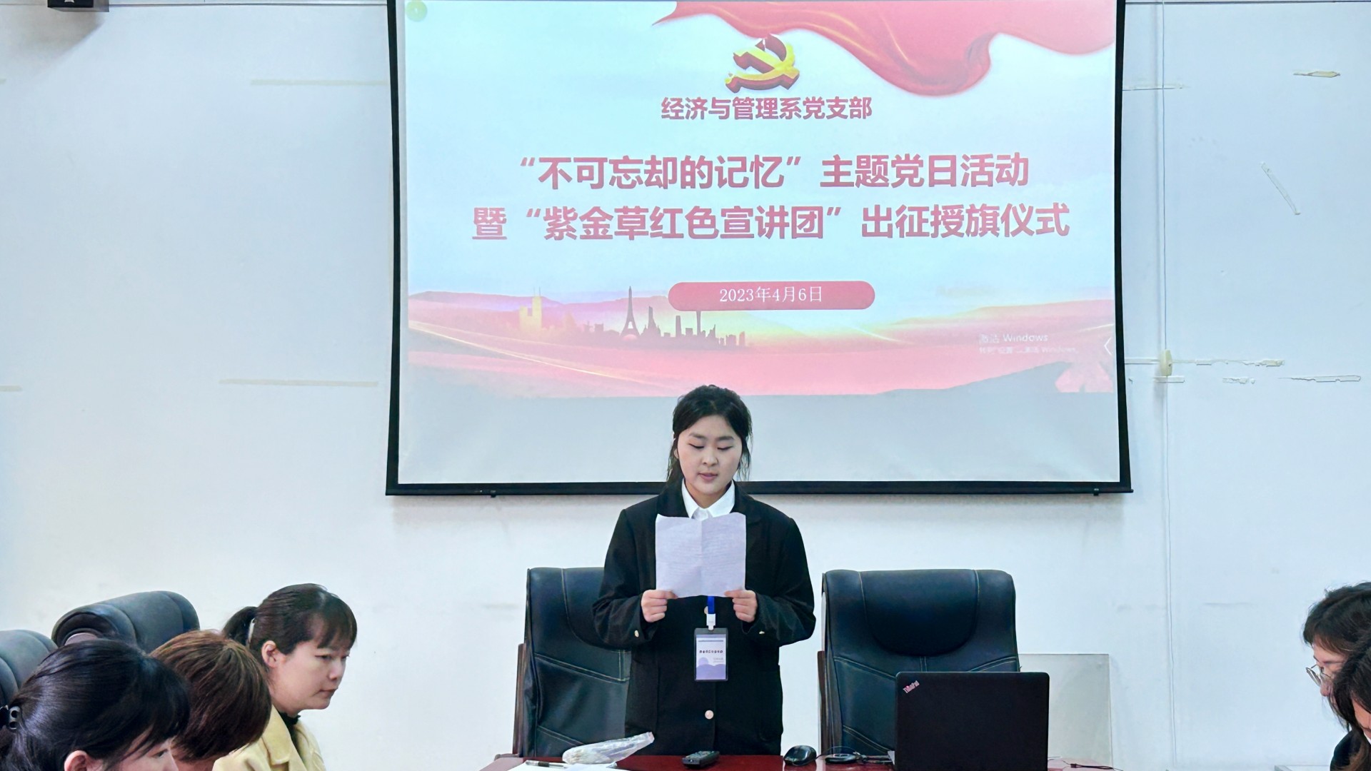 为深入学习贯彻党的二十大精神,厚植爱国情怀,传承红色基因,守好红色根脉,充分利用红色资源,深化爱国主义教育、集体主义教育、社会主义教育,讲好党的故事、革命故事、英雄的故事,着力培养堪当民族复兴大任的时代新人,依托南京电视台和平教育基地,经济与管理系正式成立“紫金草红色宣讲团”。4月6日,经济与管理系“不可忘却的记忆”党日活动暨“紫金草红色宣讲团”出征仪式在7307会议室召开。本次活动是由紫金草红色宣讲团的团员学生,带领党员教师到达拉贝纪念馆,给老师们上一堂“不一样”的思政课。