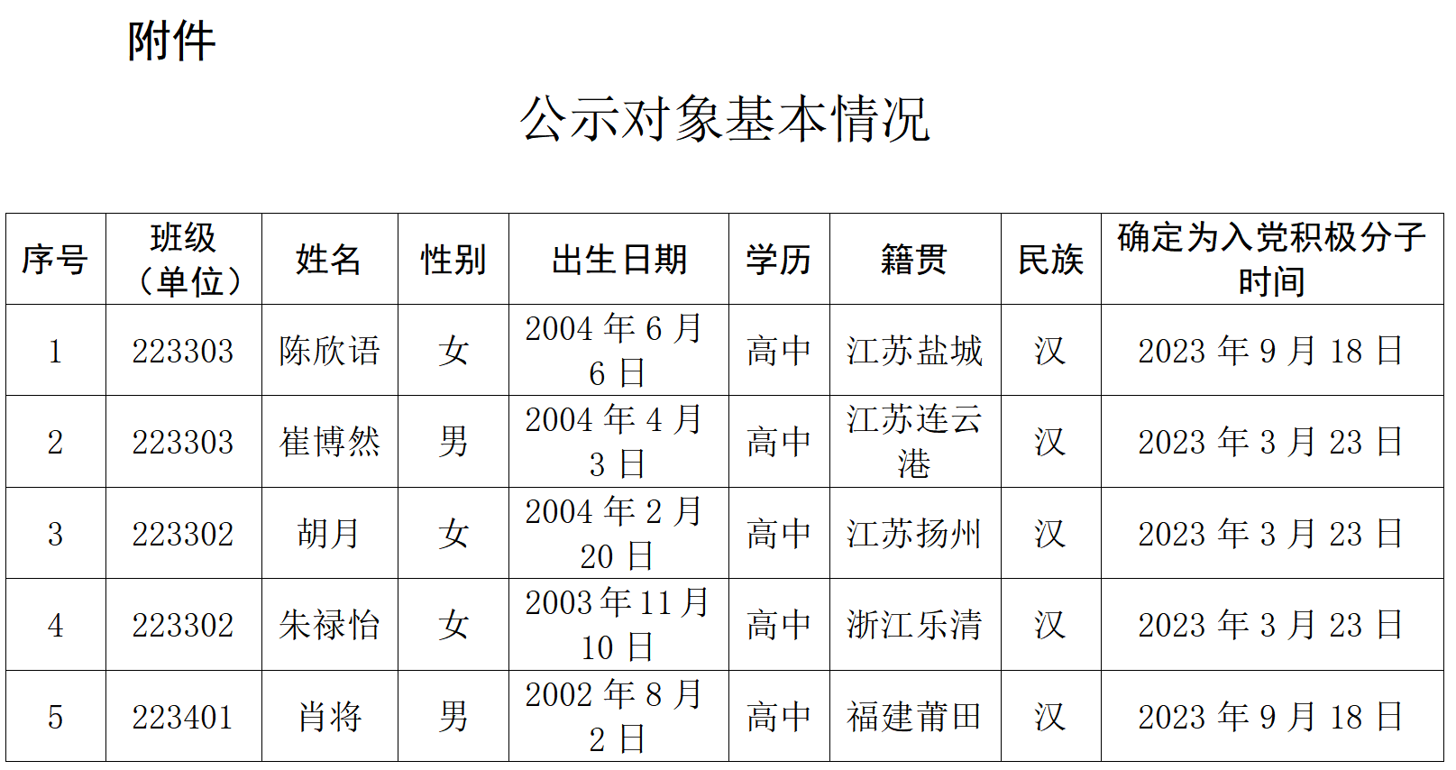 经党支部培养教育和考察,在听取党小组、培养联系人、党员和群众意见的基础上,经支委会2024年10月15日讨论,拟确定陈欣语、崔博然等5位同志为发展对象。根据发展党员工作有关要求,现将其有关情况予以公示(见附件)。